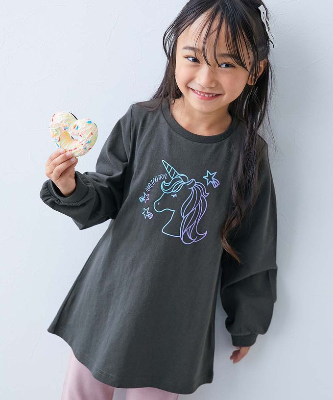 日本 devirock - 純棉甜美印花長版T恤-炫彩獨角獸-炭黑