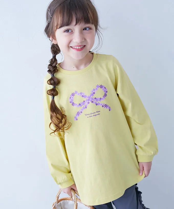 日本 devirock - 純棉甜美印花長版T恤-花圈蝴蝶結-黃