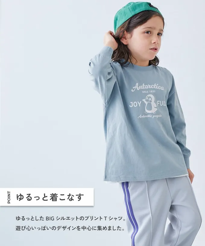 日本 devirock - 100%棉 寬鬆版型縮口長袖上衣-可愛企鵝-霧藍