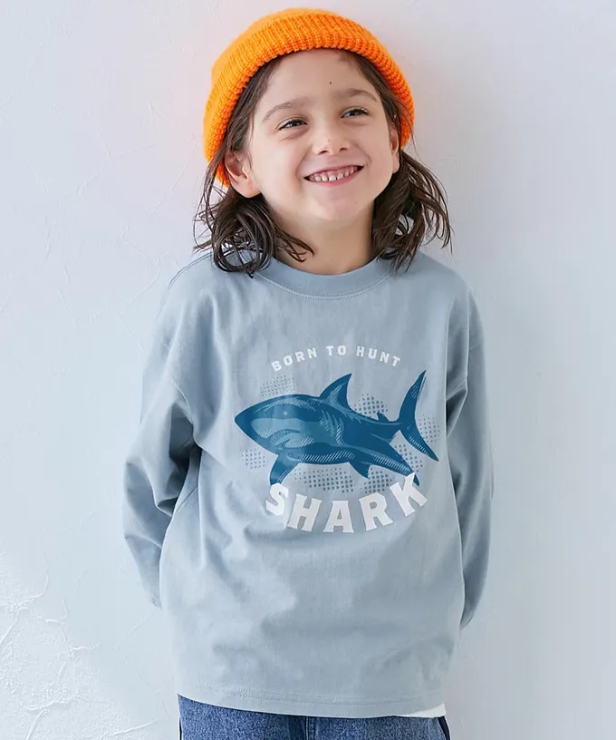日本 devirock - 100%棉 寬鬆版型縮口長袖上衣-雙手恐龍-灰藍