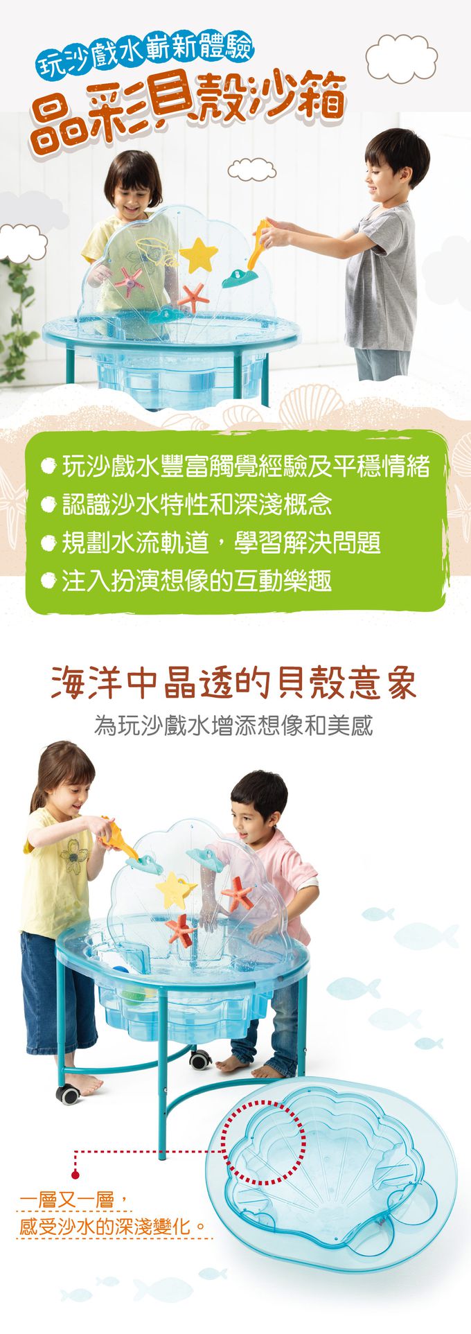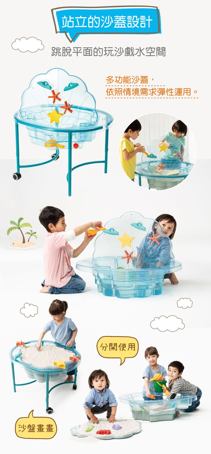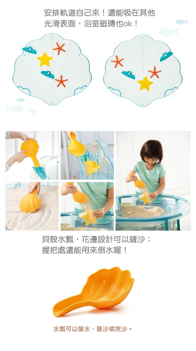 組件明細:沙箱1個、箱蓋1個、腳架4支、輪子2個、戲水6件組1套(星星灑水器1個、海浪水道2個、海星水車2個、貝殼水瓢1支)