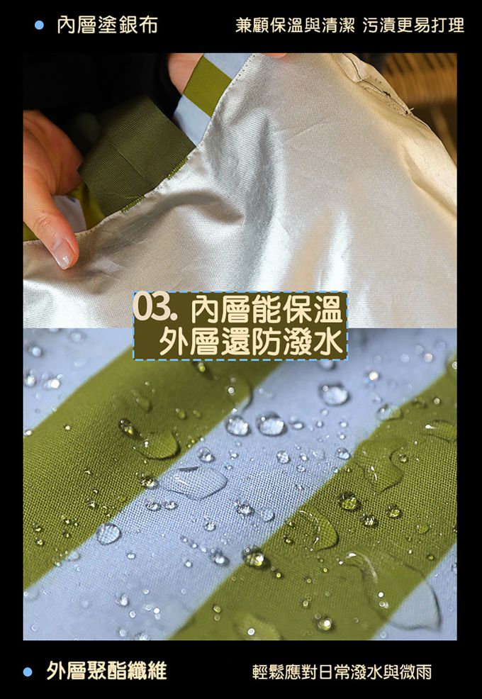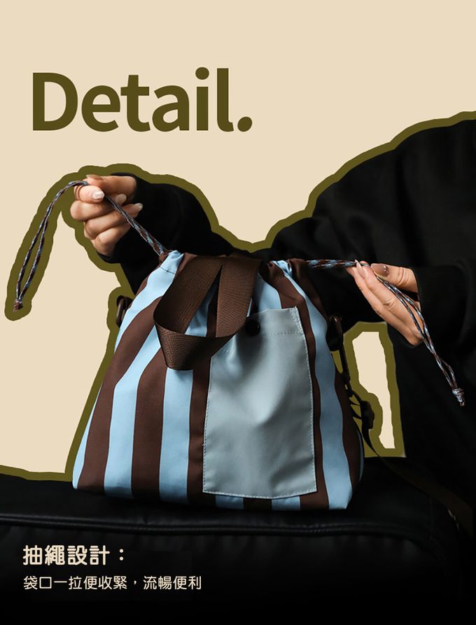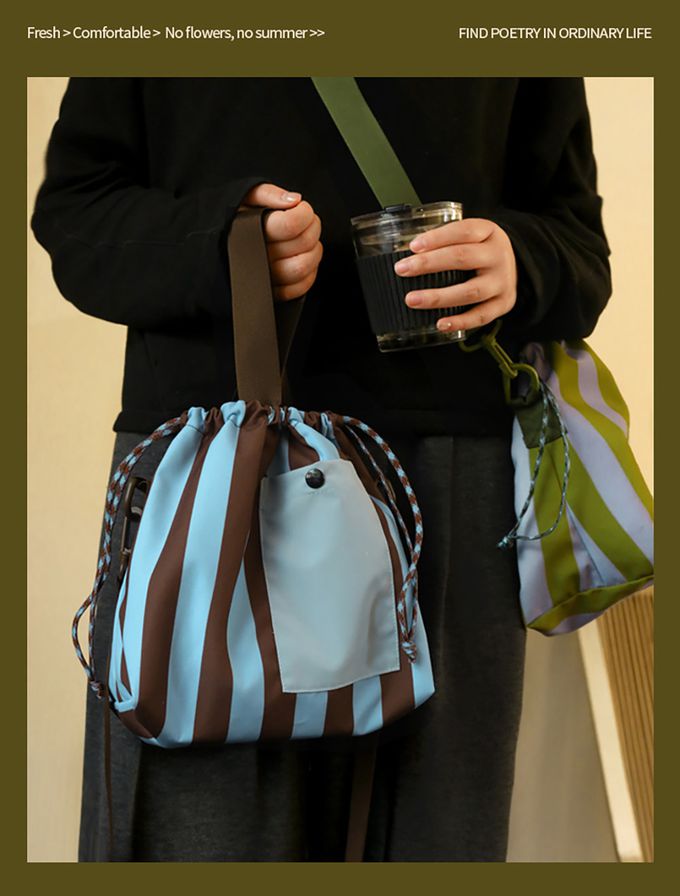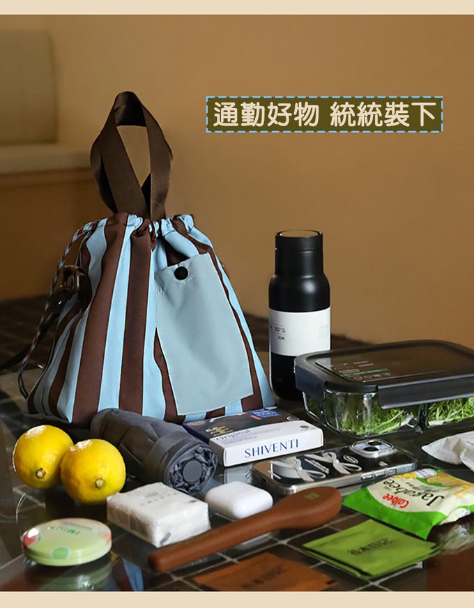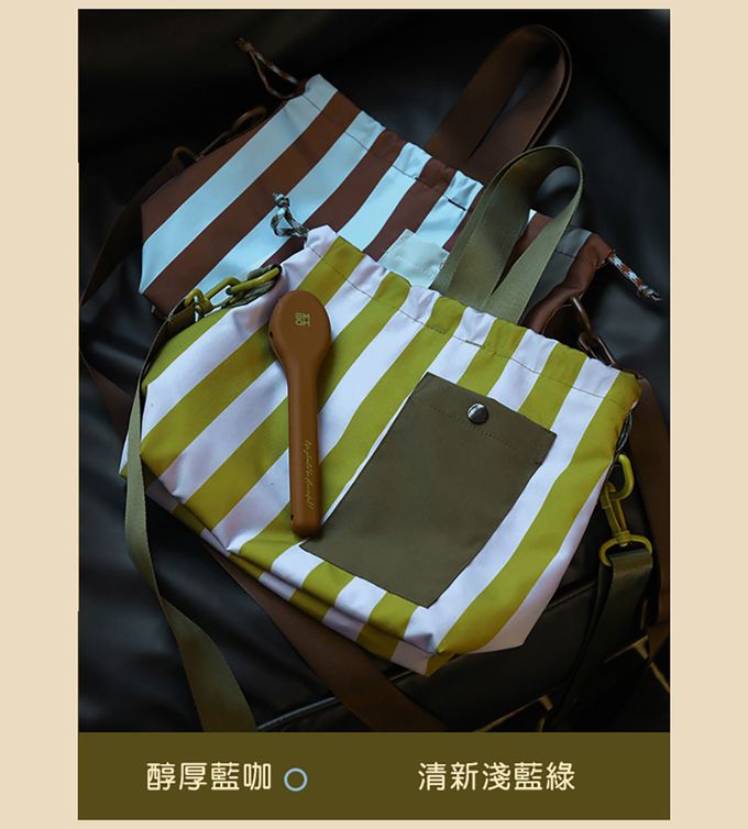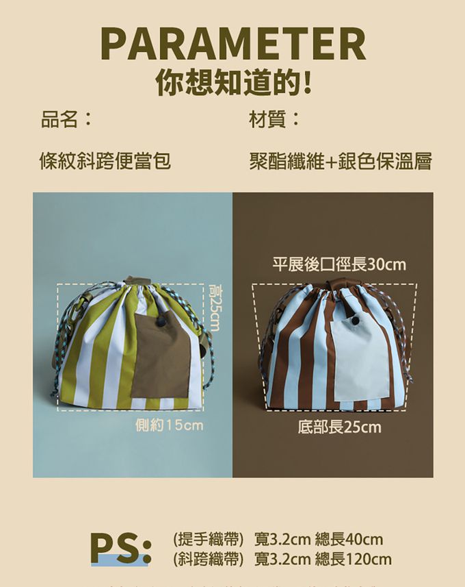 我們理解手提便當袋的方便但更懂得雙手被束縛的困擾於是設計了這款可調斜背袋便當包加寬加帶,久背不累可斜跨、可背、、可手提解放你的雙手條紋時尚設計卷層塗銀布,兼顧保溫與易清潔外層防潑水大容量設計,可裝下兩個飯盒30cm寬口徑,讓你方便拿取抽繩設計,袋口一拉便收緊放置口袋,可放餐具、零錢、小物等