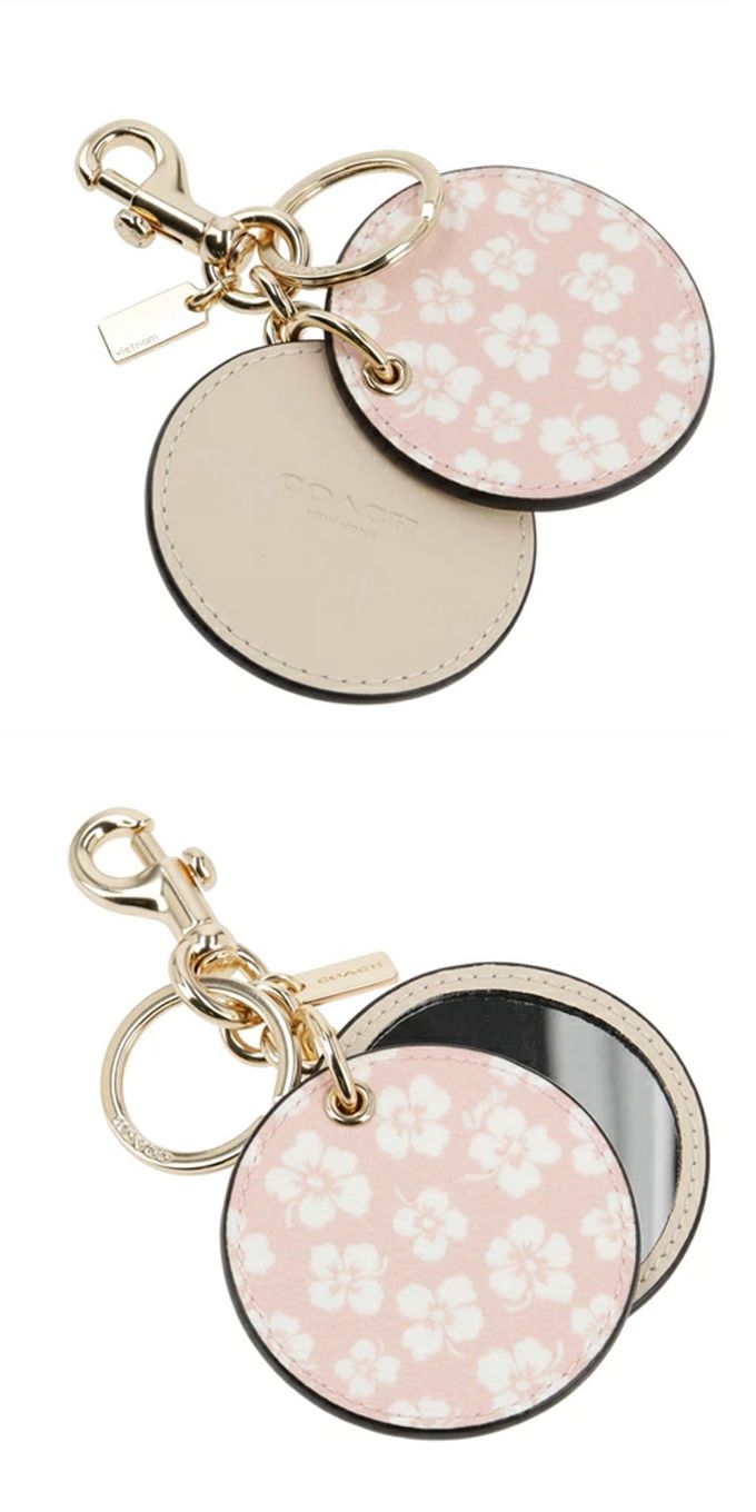 圓形印花皮革化妝鏡鑰匙圈/吊飾 (粉白花朵)