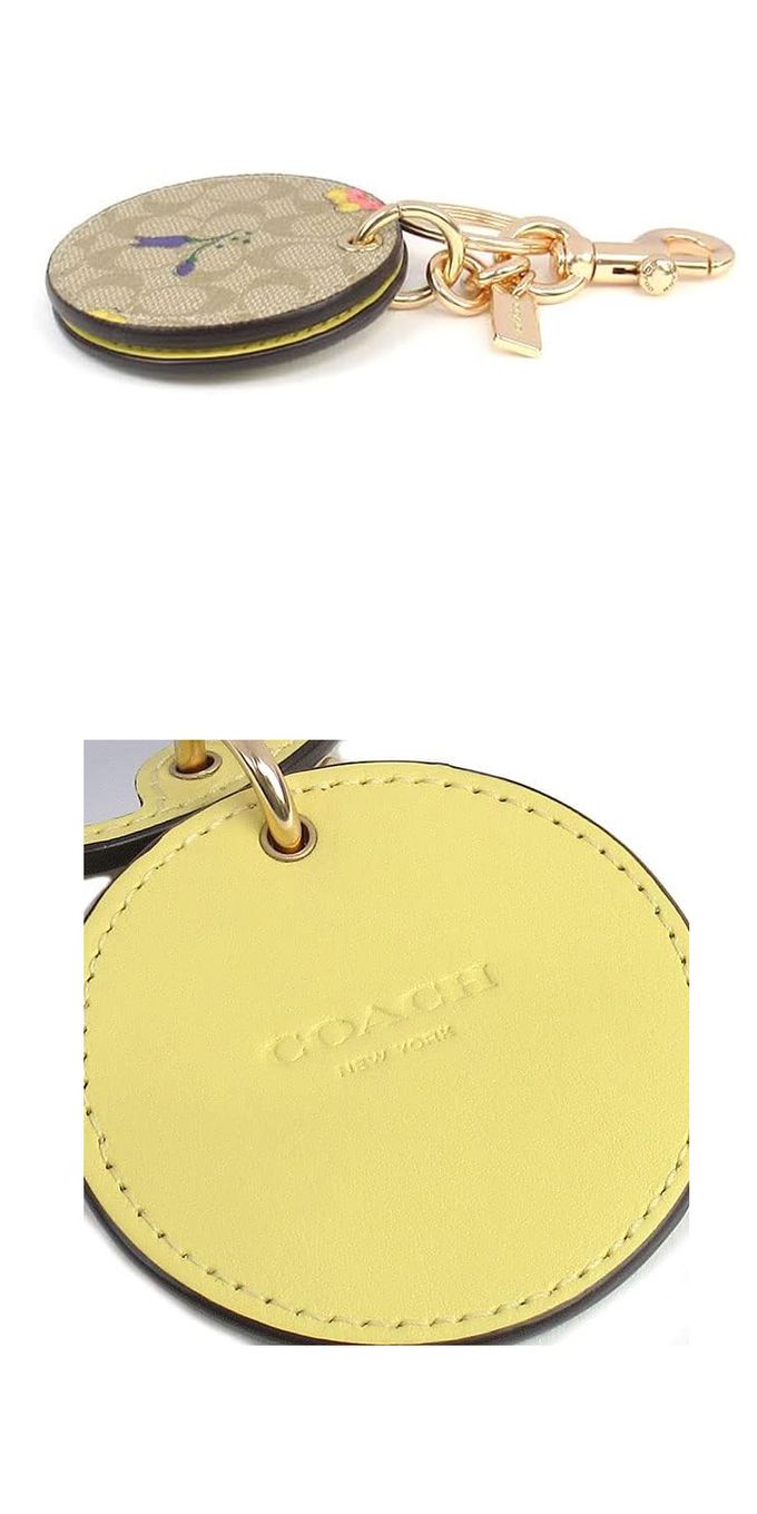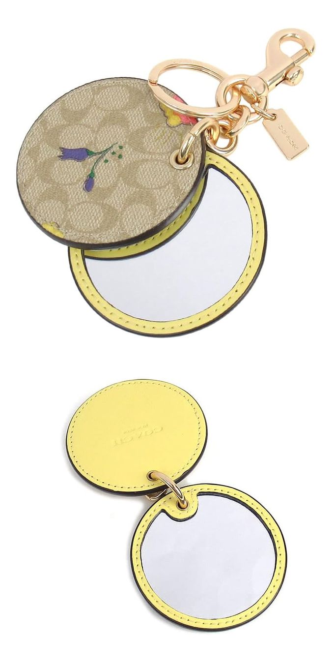 圓形印花皮革化妝鏡鑰匙圈/吊飾 (淺卡其淺黃小花)