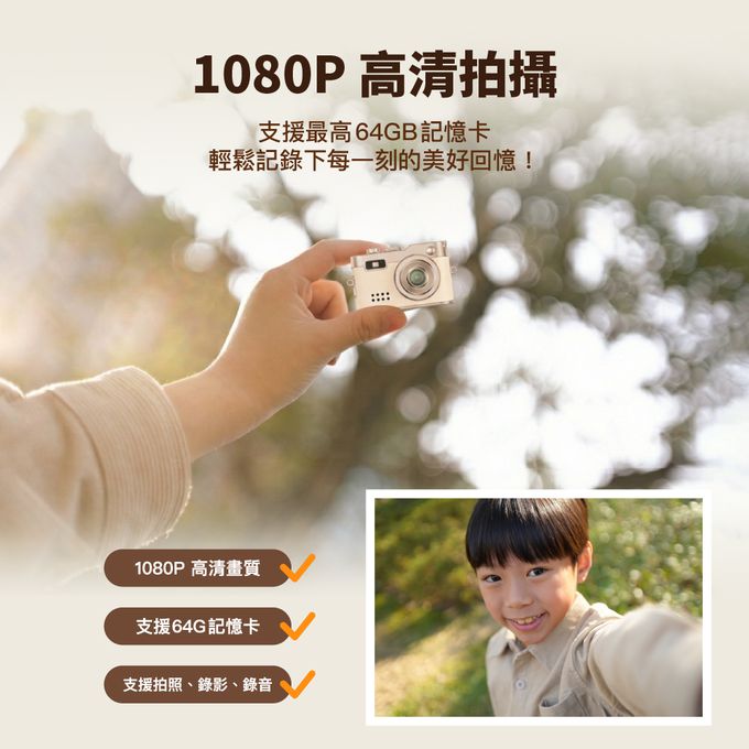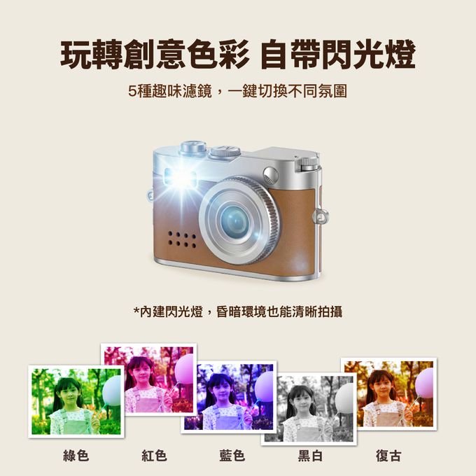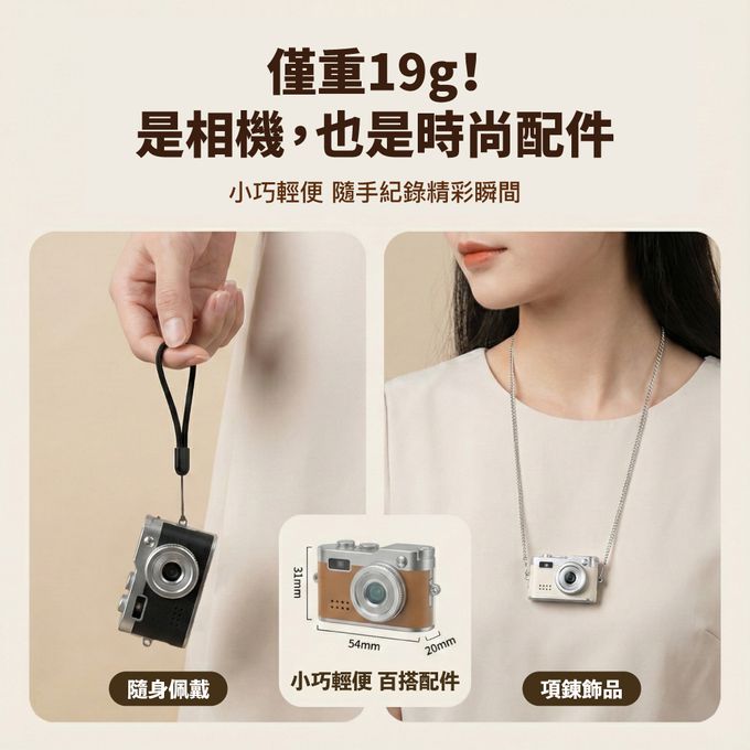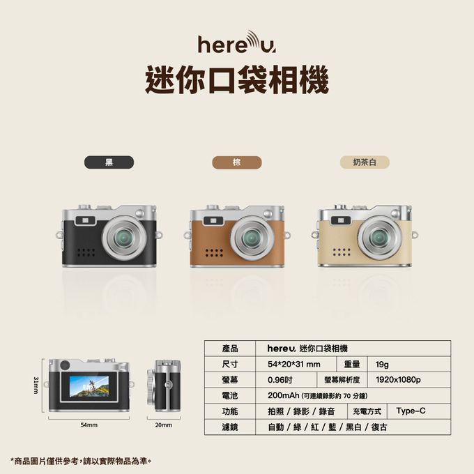 品名:hereu 迷你口袋相機尺寸:54*20*31 mm重量:19g螢幕:0.96吋電池:200mAh(可連續錄影約 70分鐘)功能:拍照 / 錄影 /錄音濾鏡:自動 /綠/紅/藍/黑白/復古螢幕解析度:1920x1080p充電方式:Type-C內容物:迷你口袋相機 x1、說明書x1、充電線x1、掛繩x1、鑰匙圈 x1、Type C轉接頭 x1