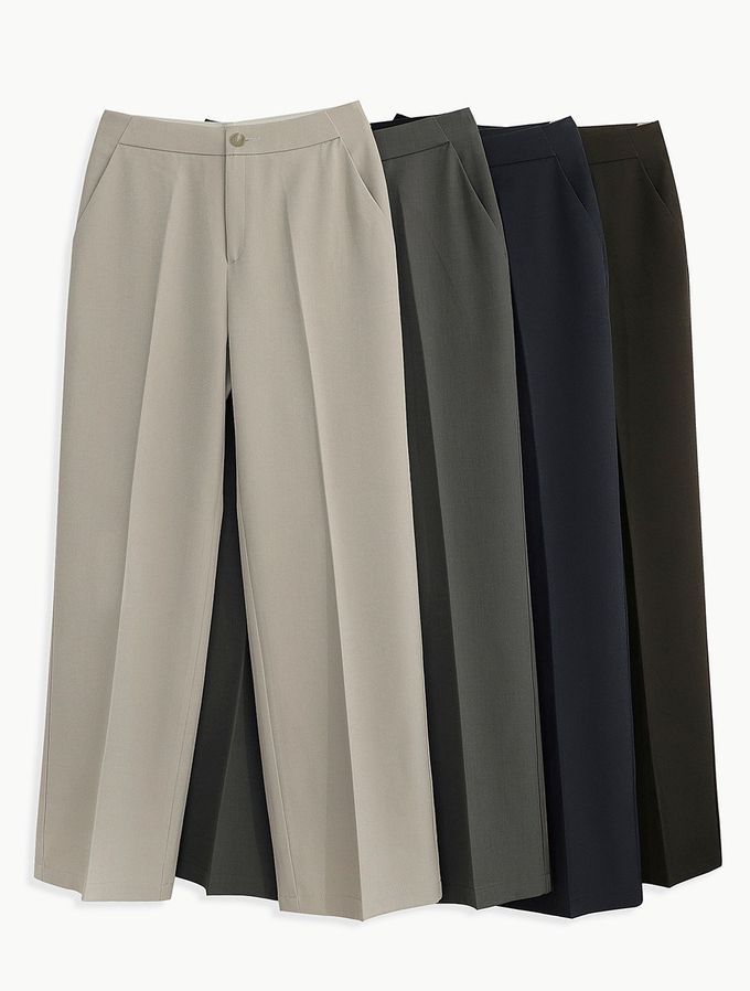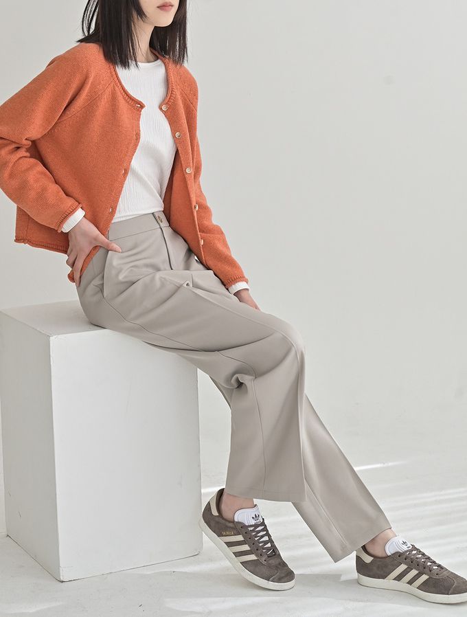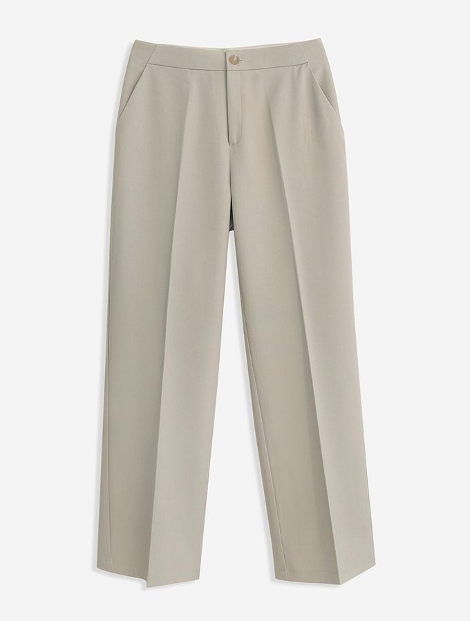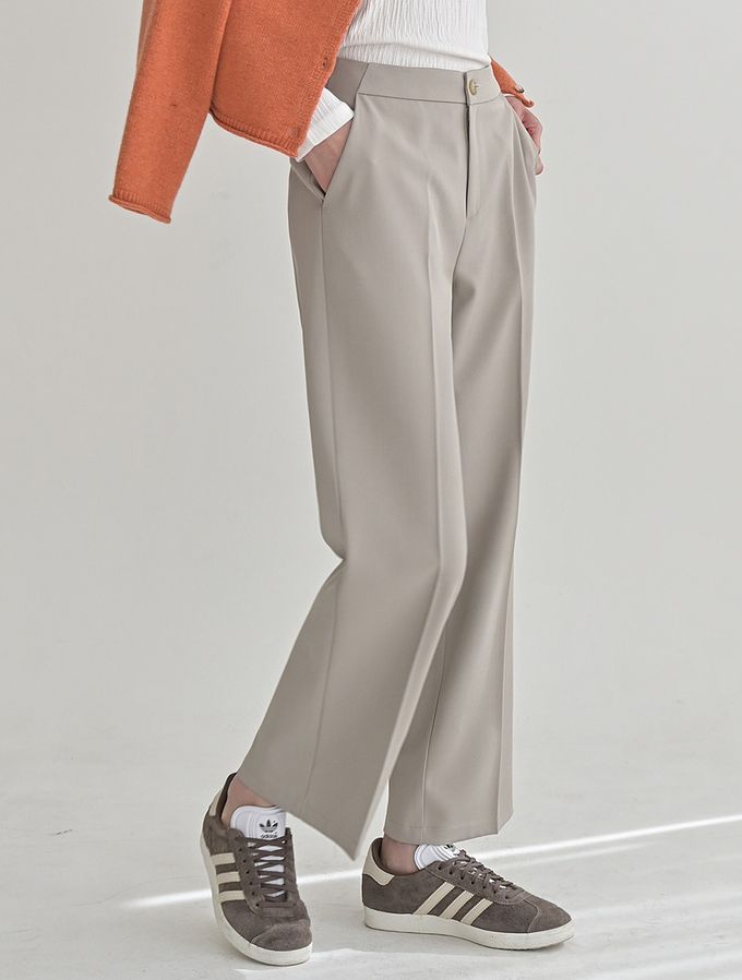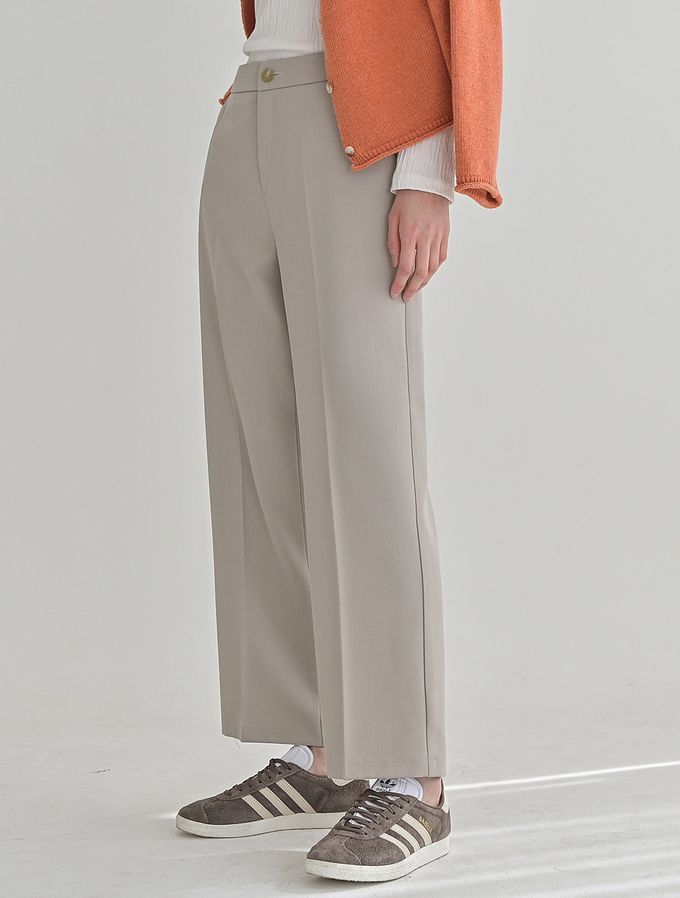 韓國女裝連線 - Domingoblue 後鬆緊腰職感直筒西裝褲-灰卡其