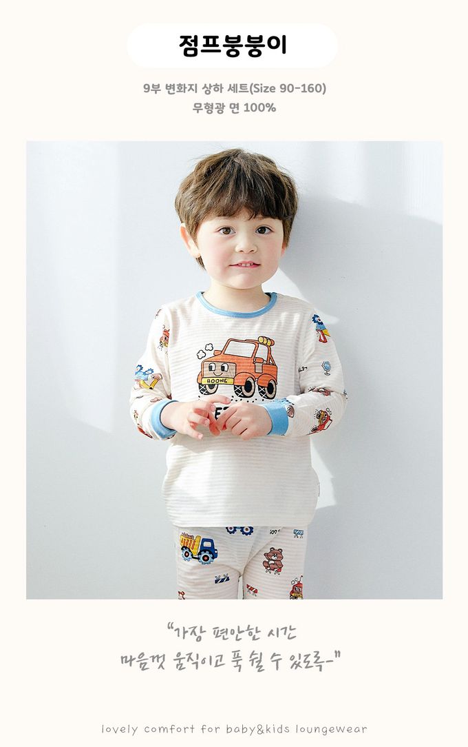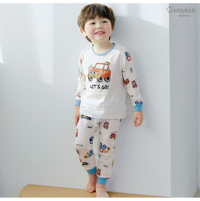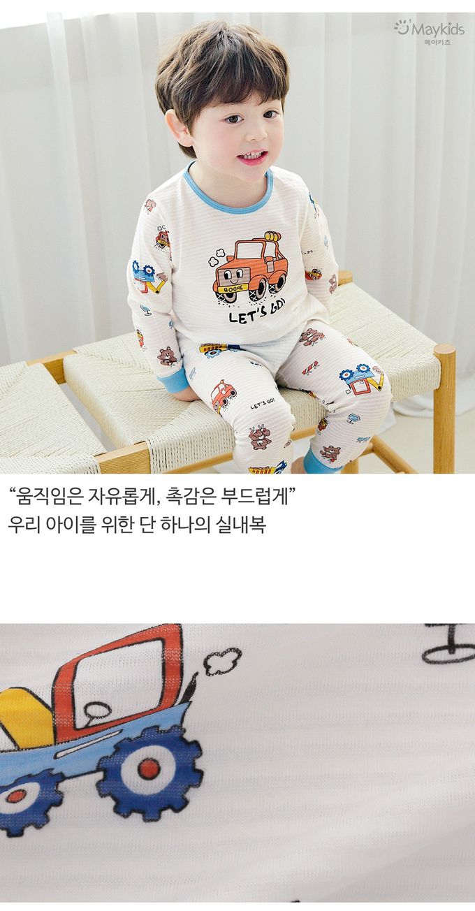 韓國 Maykids - 透氣條紋提花棉長袖家居服-Let's go!車車-米X天藍