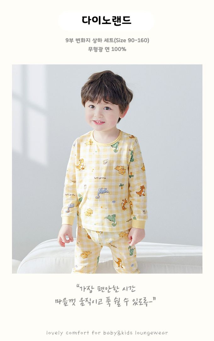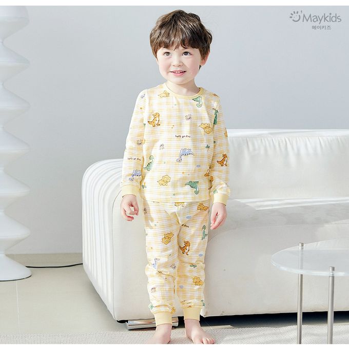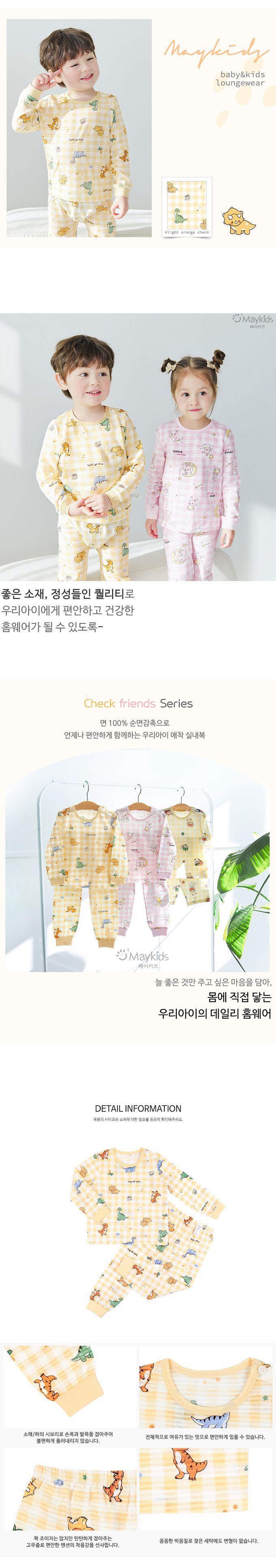 韓國 Maykids - 透氣條紋提花棉長袖家居服-童趣恐龍-橘黃格紋