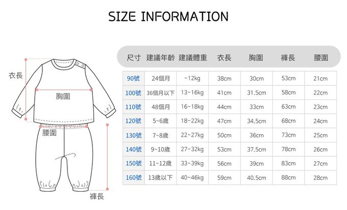 1. 尺寸表單位皆為公分(cm),實際尺寸會因布料彈性、水洗、測量起迄點等因素略有誤差。建議參考孩子平時穿著衣物尺寸進行選購。