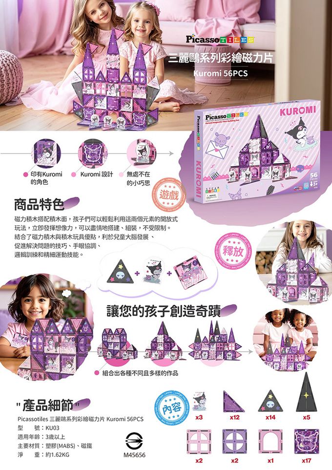 注意事項:【商品規格】 適用年齡:3歲以上 主要材質:塑膠(MABS)、磁鐵 淨重:約1.62kg 產地:中國 商品檢驗標識號:M45656 【注意事項】 ● 需成人在旁監護下使用。 ● 請不要蠻力彎折或拉扯本產品。 ● 本產品不適合3歲以下兒童使用。 ● 本產品請勿接觸或存放於高溫火源等環境中。 ● 每次使用前請檢查有無破損,如有請勿再使用。 ● 使用後請妥善保管勿讓未滿適用年齡的兒童取得。 ● 本產品含有細小零件,請勿放入口中避免發生窒息危險。 ● 為避免嬰兒或兒童產生窒息之危險,請於拆卸後立即將此塑膠袋銷毀或遠離嬰兒及兒童。 ● 使用方式請詳見說明書。