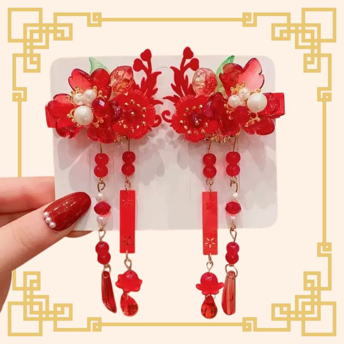 品名:新年拜年梅花紅琉璃花珍珠點綴吊墜髮飾對夾