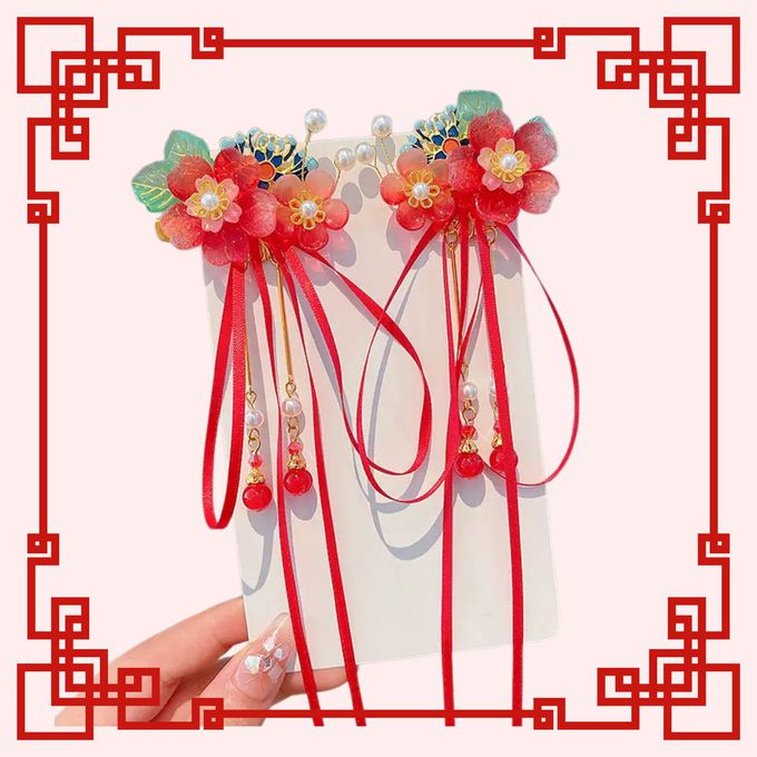 新年拜年漸層紅琉璃花緞帶飄帶吊墜髮飾對夾