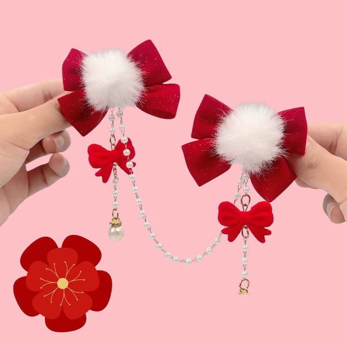 新年拜年毛球紅絲絨蝴蝶結相連珍珠鏈對夾髮飾
