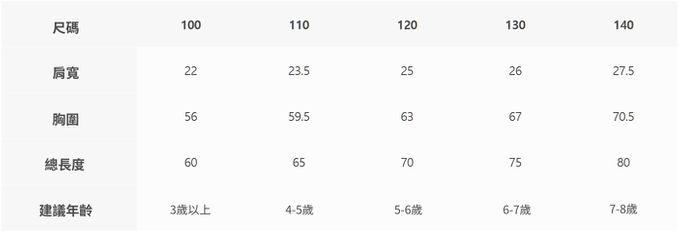 2. 尺寸表乃依平均值制定,每位孩童發育情形不同,請參考模特試穿資訊、既有衣物等,並依實際測量結果為準。