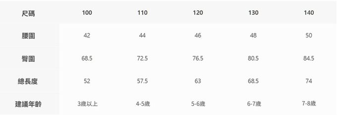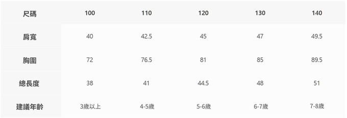 2. 尺寸表乃依平均值制定,每位孩童發育情形不同,請參考模特試穿資訊、既有衣物等,並依實際測量結果為準。