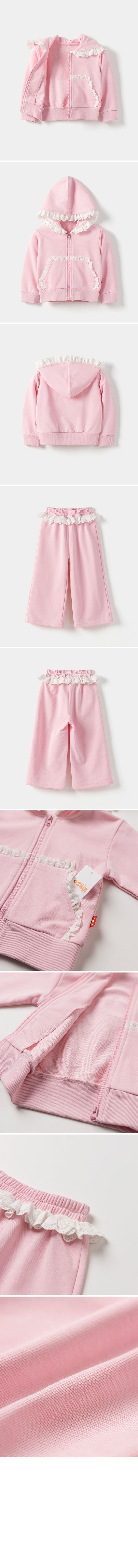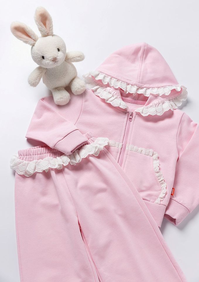 韓國 OZKIZ - 浪漫花邊蕾絲點綴連帽外套X長褲套裝-粉