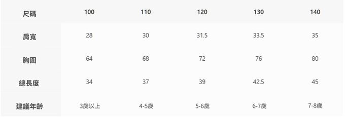 2. 尺寸表乃依平均值制定,每位孩童發育情形不同,請參考模特試穿資訊、既有衣物等,並依實際測量結果為準。