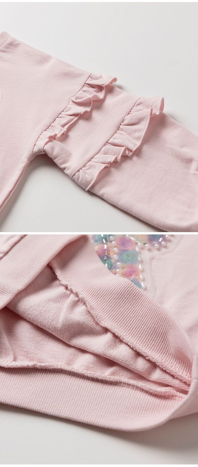 • 品名:繽紛網紗玫瑰珠飾蝴蝶結荷葉邊袖大學T