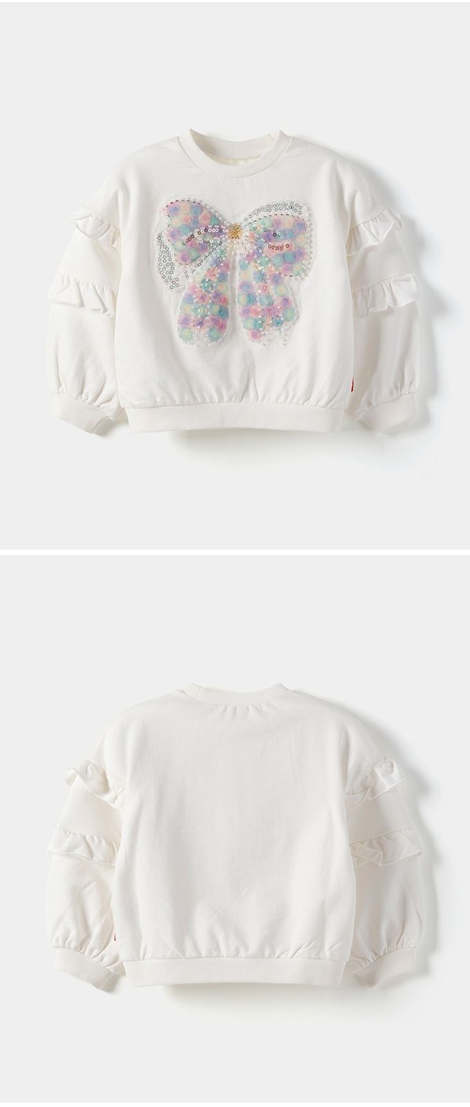 韓國 OZKIZ - 繽紛網紗玫瑰珠飾蝴蝶結荷葉邊袖大學T-白