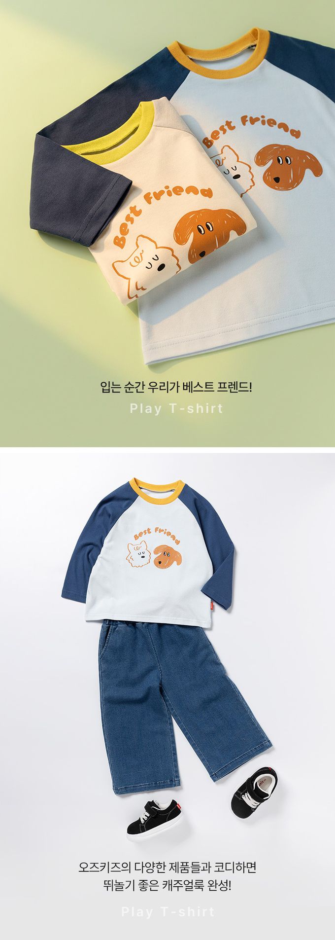韓國 OZKIZ - 手繪塗鴉狗狗拼色長袖上衣-淺灰X米