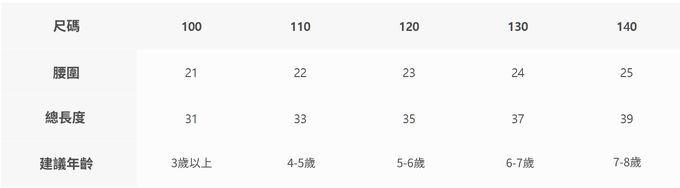 2. 尺寸表乃依平均值制定,每位孩童發育情形不同,請參考模特試穿資訊、既有衣物等,並依實際測量結果為準。