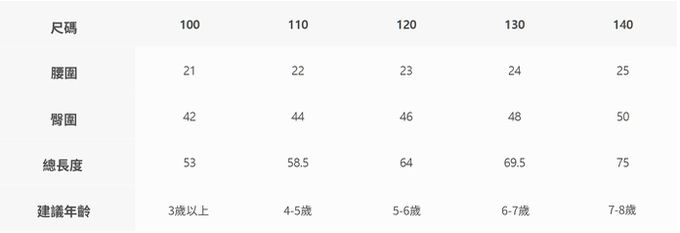2. 尺寸表乃依平均值制定,每位孩童發育情形不同,請參考模特試穿資訊、既有衣物等,並依實際測量結果為準。