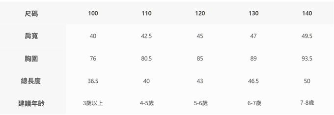 2. 尺寸表乃依平均值制定,每位孩童發育情形不同,請參考模特試穿資訊、既有衣物等,並依實際測量結果為準。
