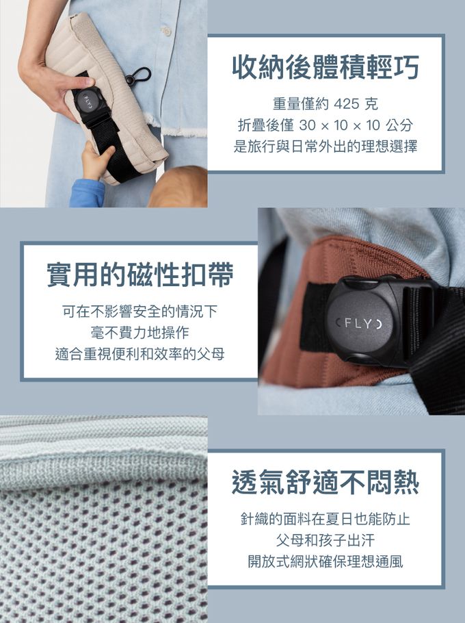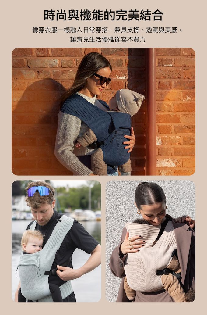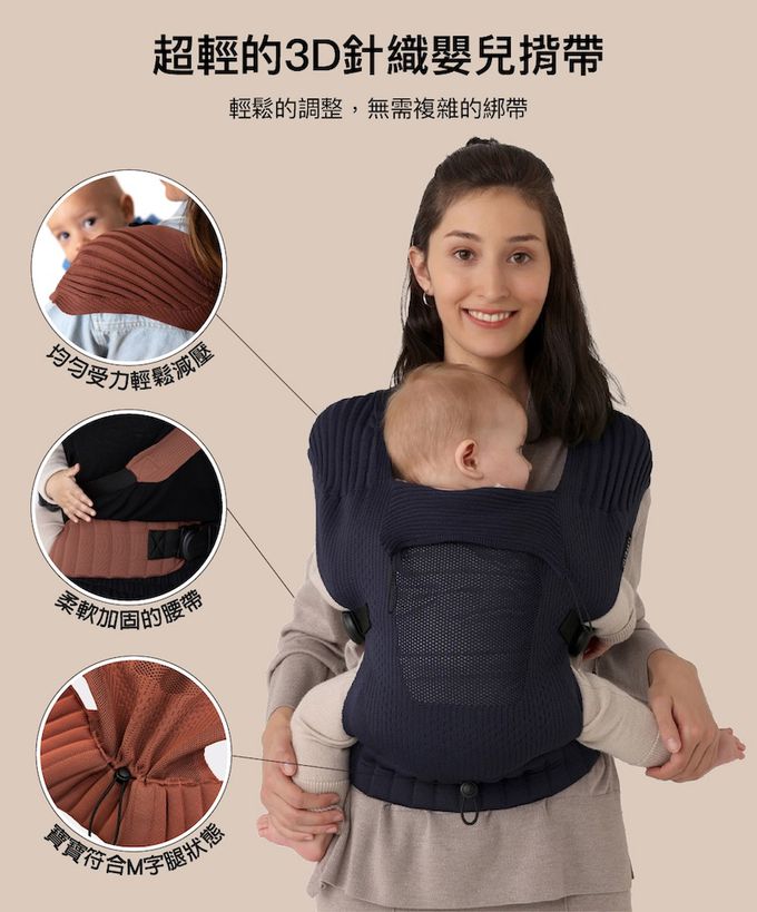 採用創新 3D 針織工藝,無縫貼合、零壓力點。布料依不同彈性區域精準編織,為寶寶與父母的各種體型提供穩定且舒適的支撐
