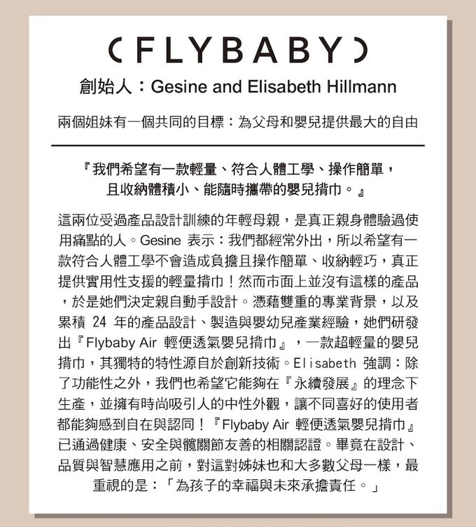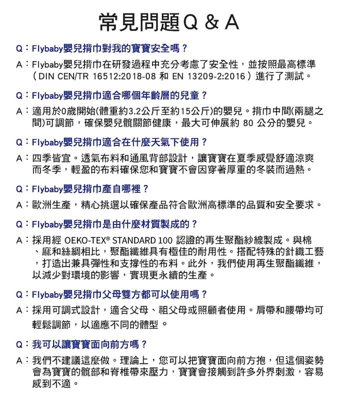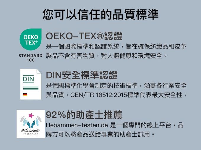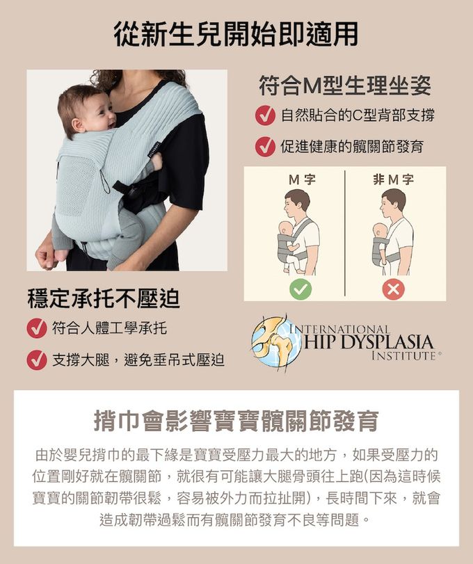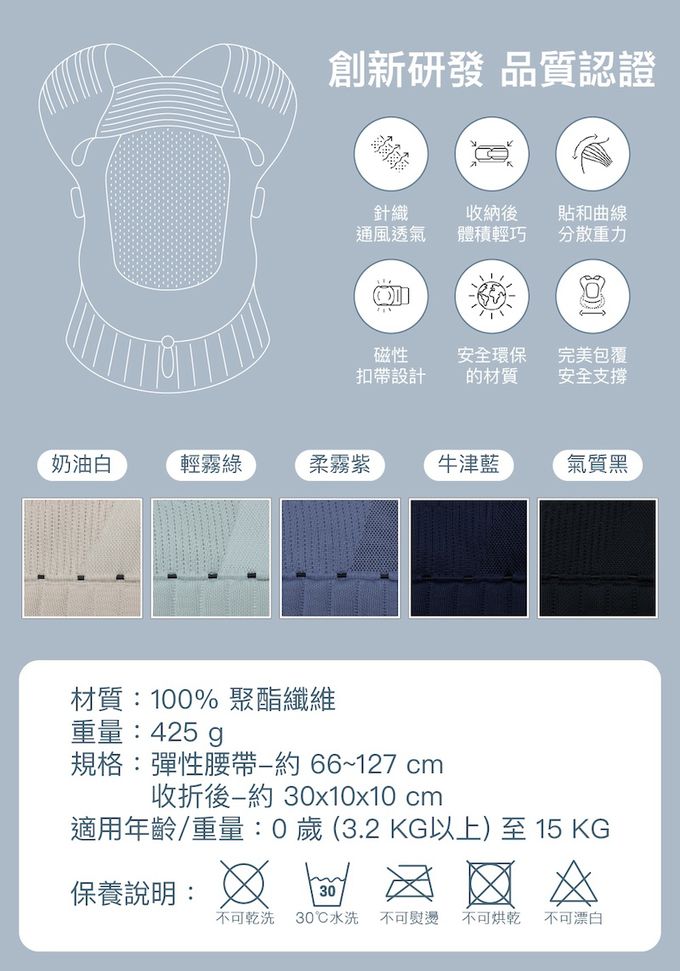以 100% 再生聚酯纖維精密 3D 編織製成,通過 OEKO-TEX® STANDARD 100 無毒安全標準,並榮獲 國際髖關節發育不良研究所 (IHDI) 認證,給寶寶最安心的支撐