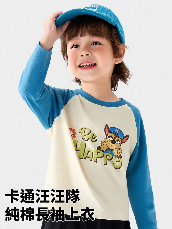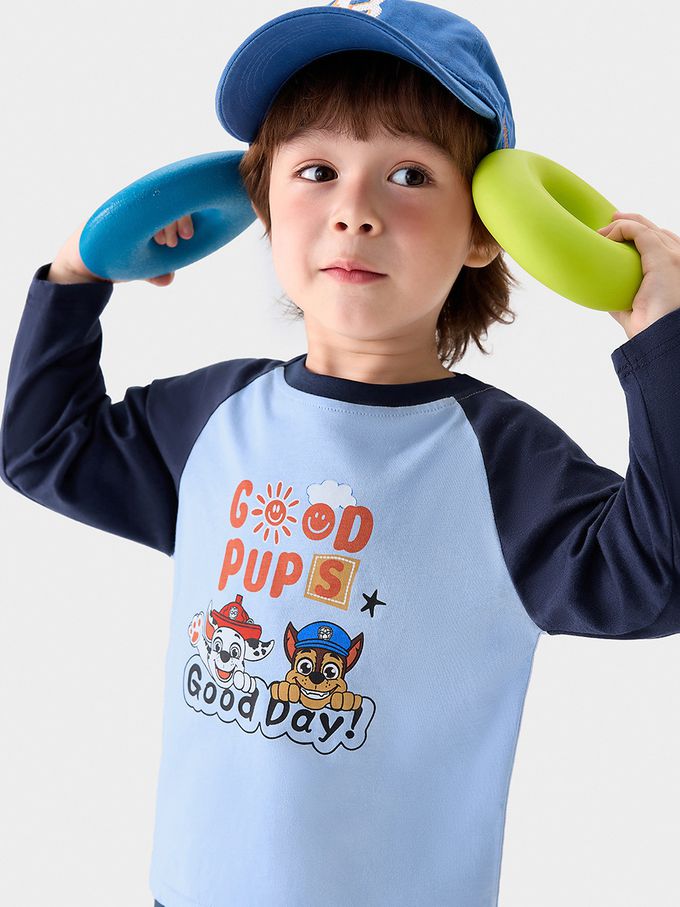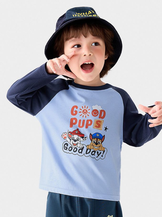 卡通汪汪隊純棉長袖上衣-卡通人物阿奇/毛毛-拼色藍
