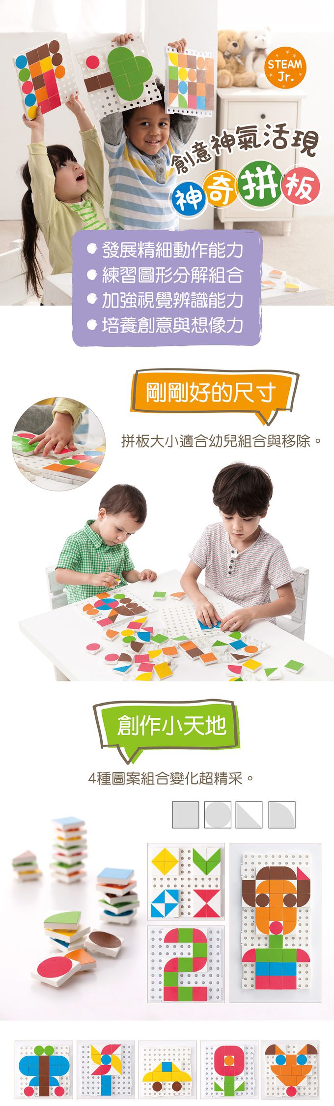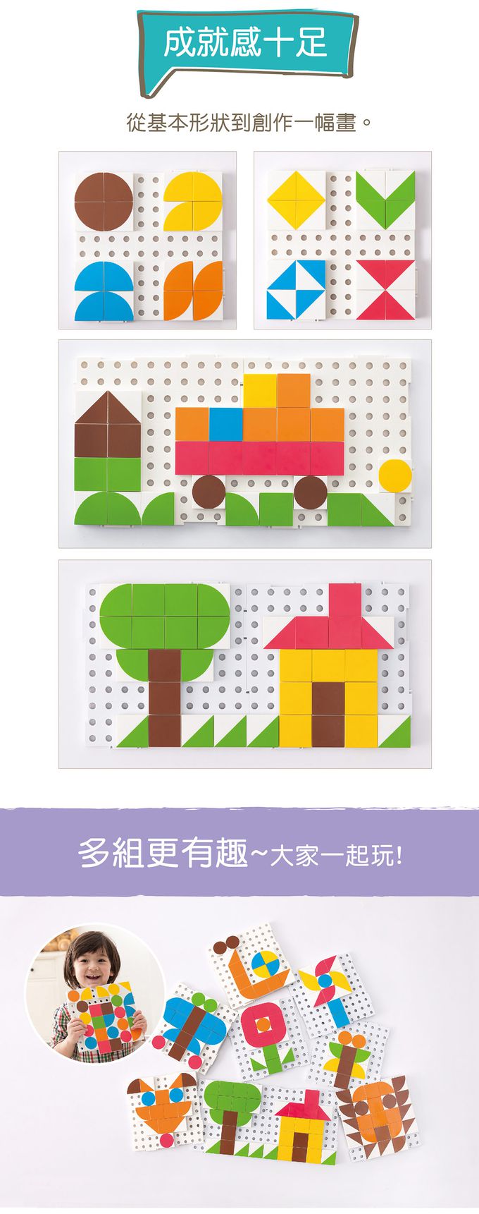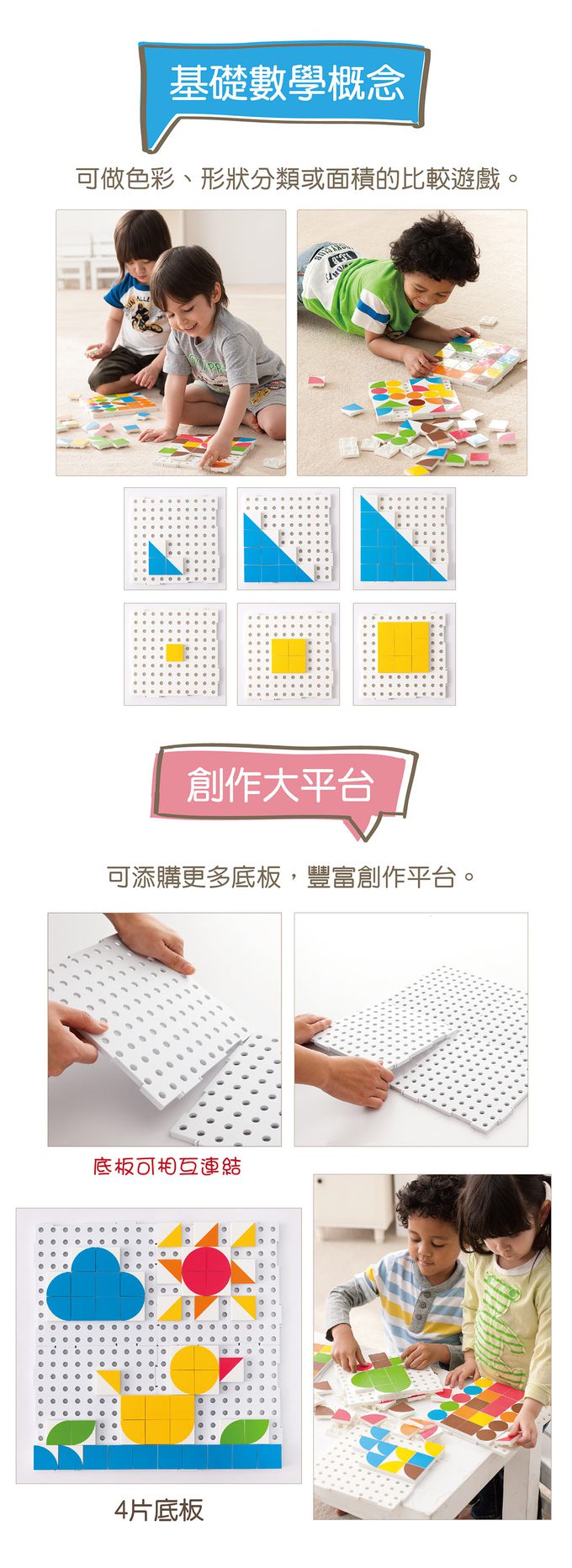 商品尺寸:底板-長20cm × 寬20cm × 高0.8cm拼板-長4cm × 寬4cm × 高1.3cm組件明細:底板2片、拼板75個(4種形狀、6色),共77件。商品材質:ABS產地:台灣★通過歐盟CE產品品質認證與美國ASTM安規