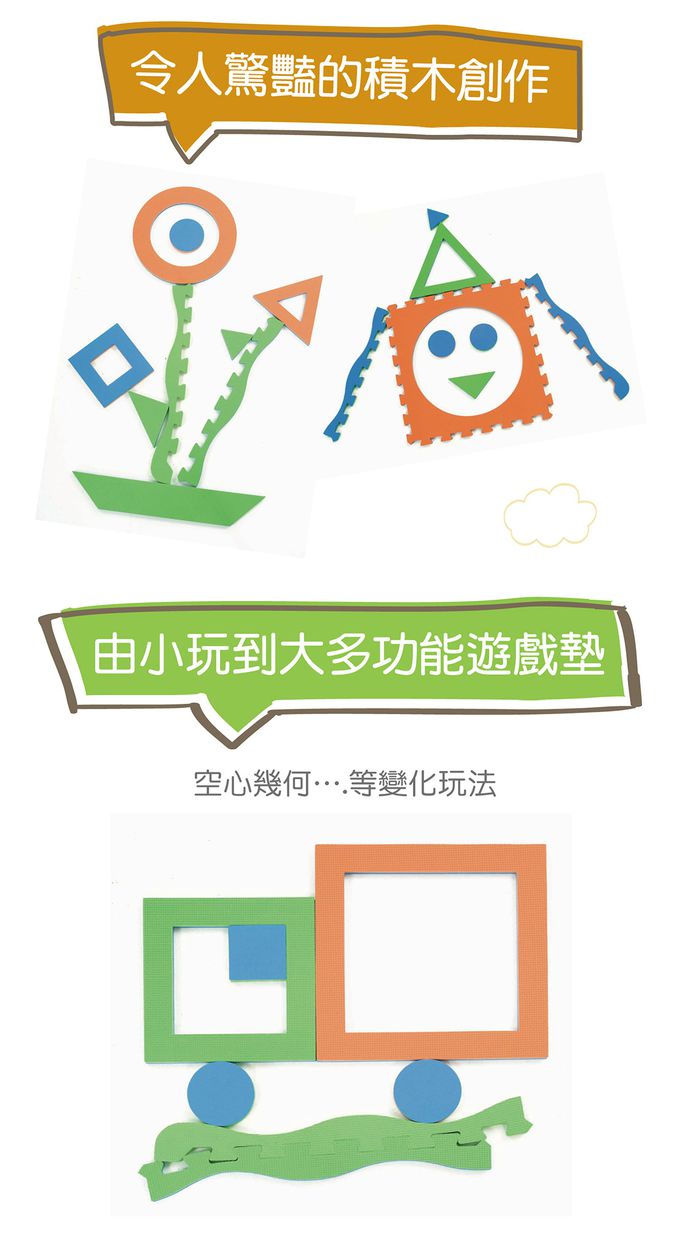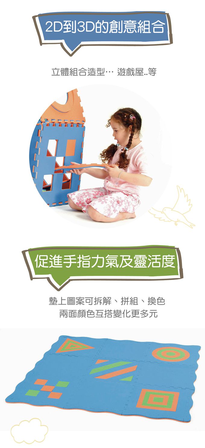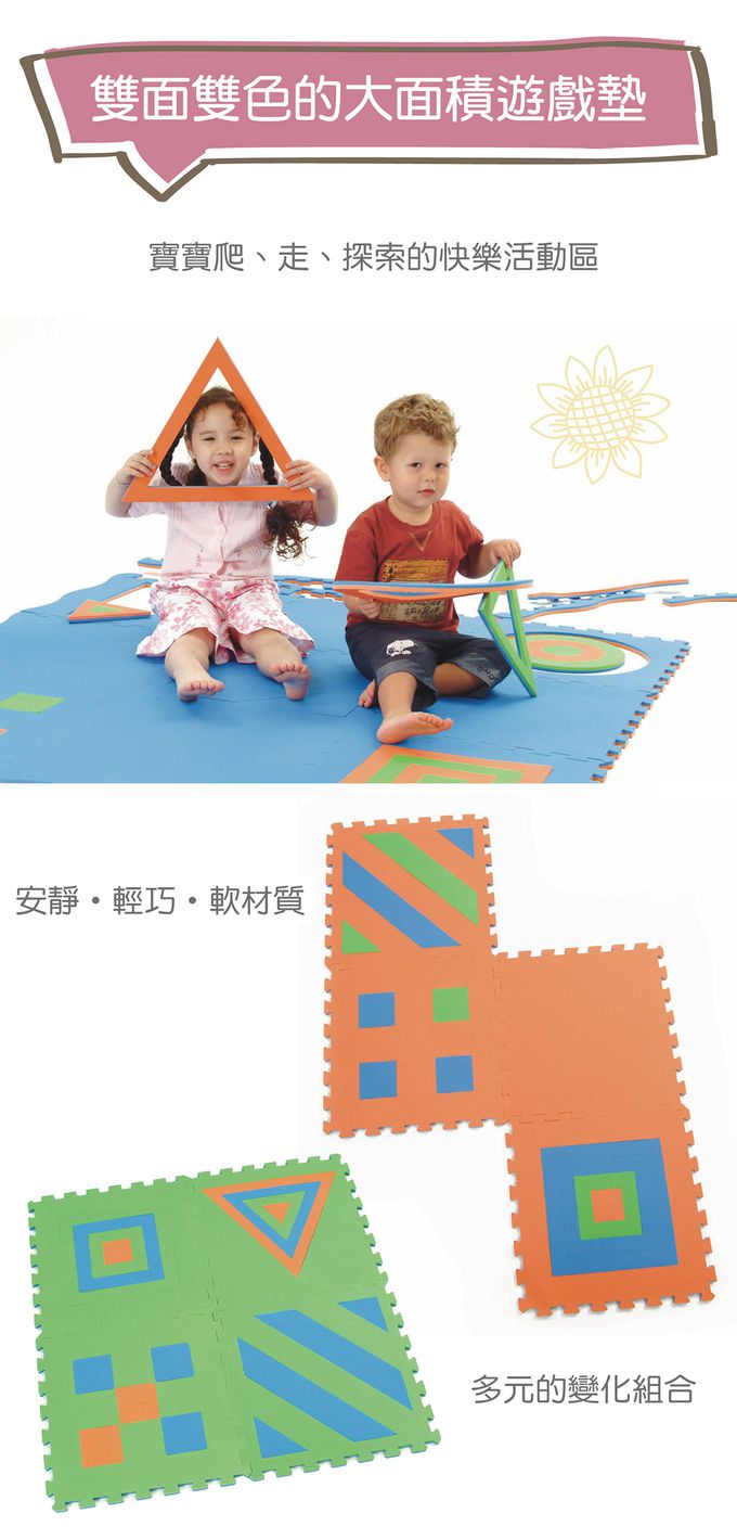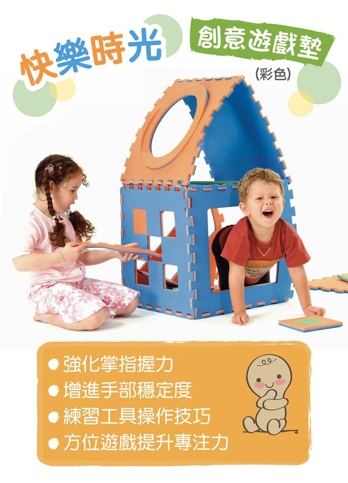 - 大面積的遊戲墊是幼兒爬、走、探索的快樂活動區,進而促進動作發展能力。