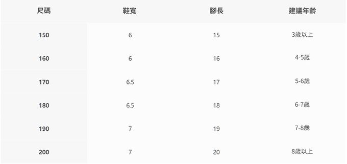 2. 每個尺寸的建議年齡、建議身高僅供參考,每位孩子發育狀況各有不同,建議參考寶貝現有的鞋子尺寸做對照。