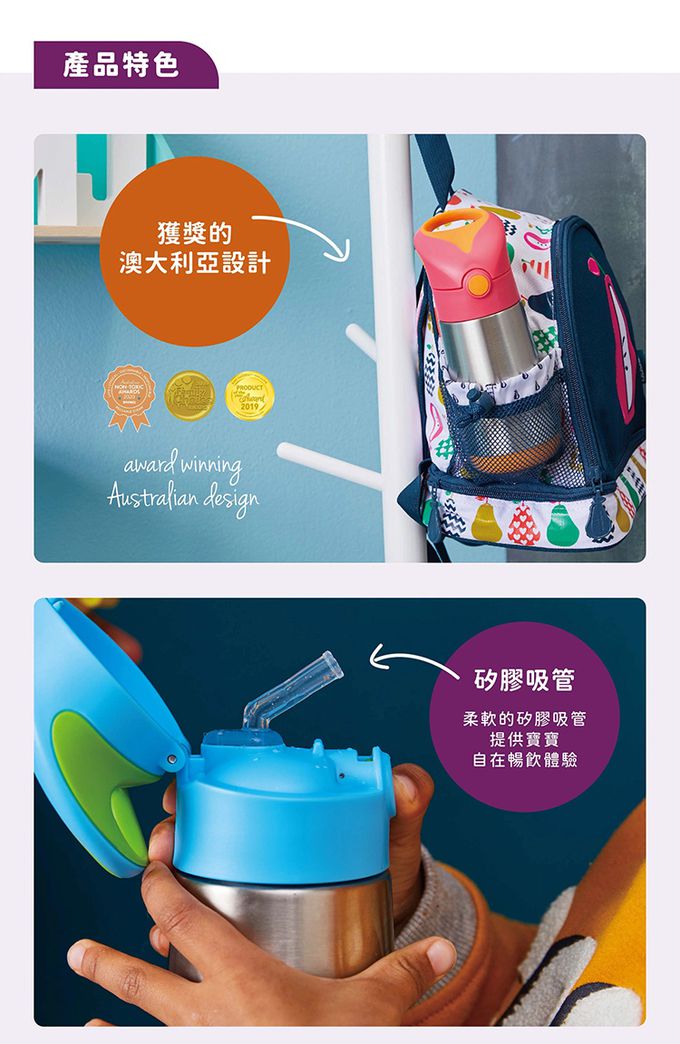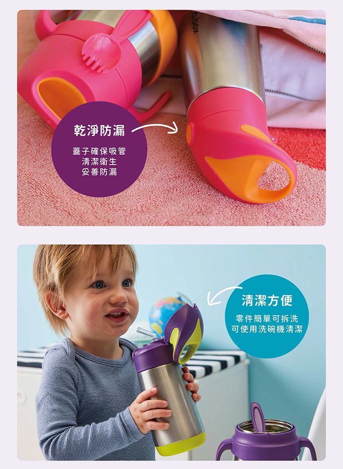 注意事項:【商品規格】 適用年齡:1歲以上 容量:350ml 材質/耐溫:《杯身》不鏽鋼/120°C;《杯蓋、吸管》PP/100°C;《吸嘴》矽膠/220°C 產地:中國 【注意事項】 ● 初次使用前,請先以中性清潔劑清洗。 ● 使用後請立即清洗並保持乾燥。 ● 如發現裂痕、變形或異常,請立即停止使用。 ● 產品零件需定期更換。 ● 請勿將產品存放於陽光照射或高溫處。 ● 請勿使用微波或沸水消毒。 ● 不可使用於微波爐。 ● 供食品接觸用途。 ● 供重複使用。