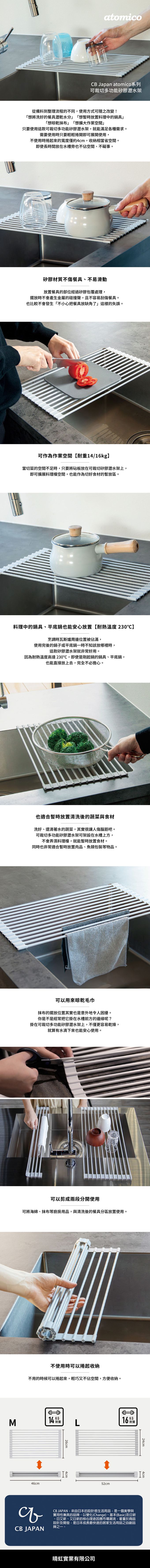 從備料到整理,依作業流程的不同,使用方式隨之改變,可以滿足各種使用需求。不管是想將清洗後的餐盤瀝乾水分、或是想要擴展料理時的作業空間,以及想在料理途中暫時放置鍋具或蔬菜、晾乾抹布等等,皆非常適合使用。使用時展開,不使用時可捲圓收納,收納方便。