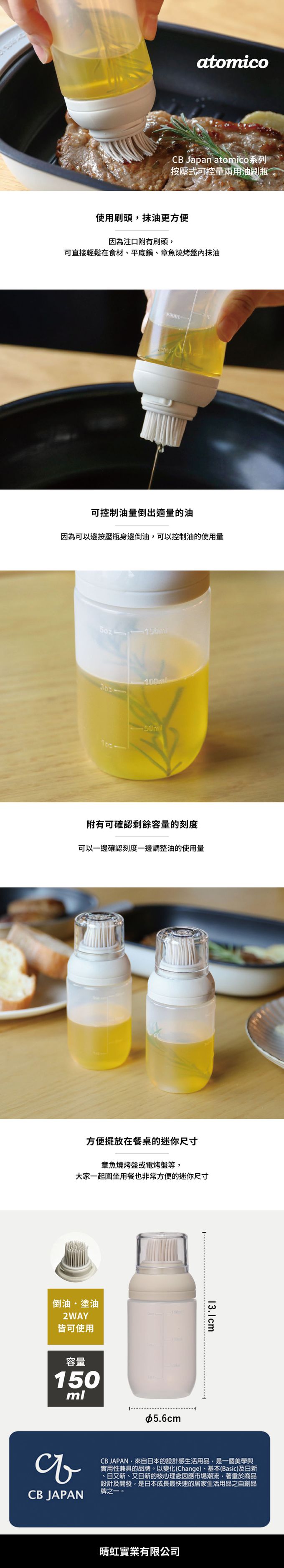 可「倒油.抹油」的按壓式可控量兩用油刷瓶,最大特色在於按壓瓶身時可自由調整出油量,特別適合在意熱量,或需要依照食譜精準料理的人。瓶身側面設有刻度,可清楚確認瓶內剩餘油量。透過刻度可調整使用量,讓料理時的計量與油量管理更加輕鬆。