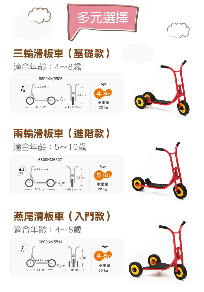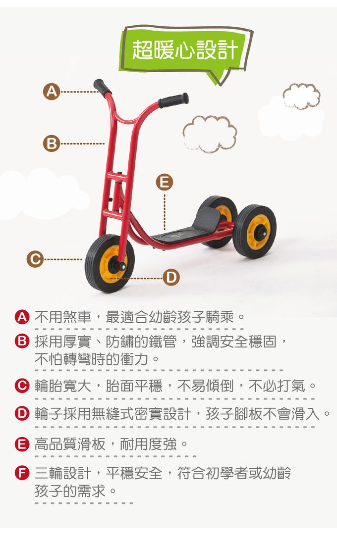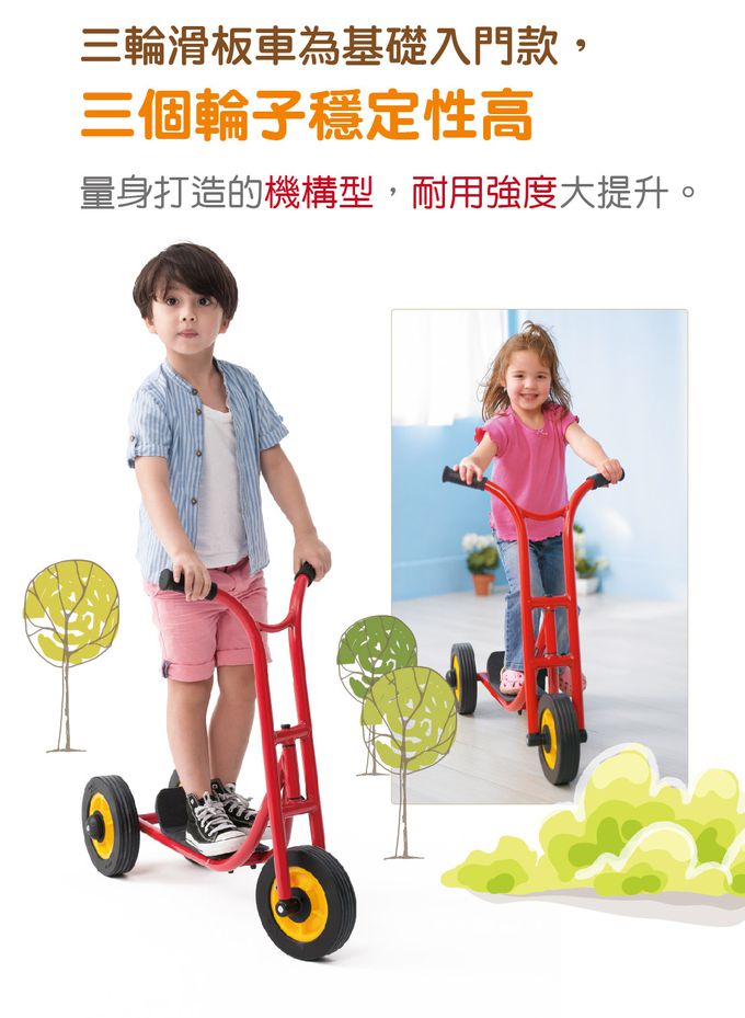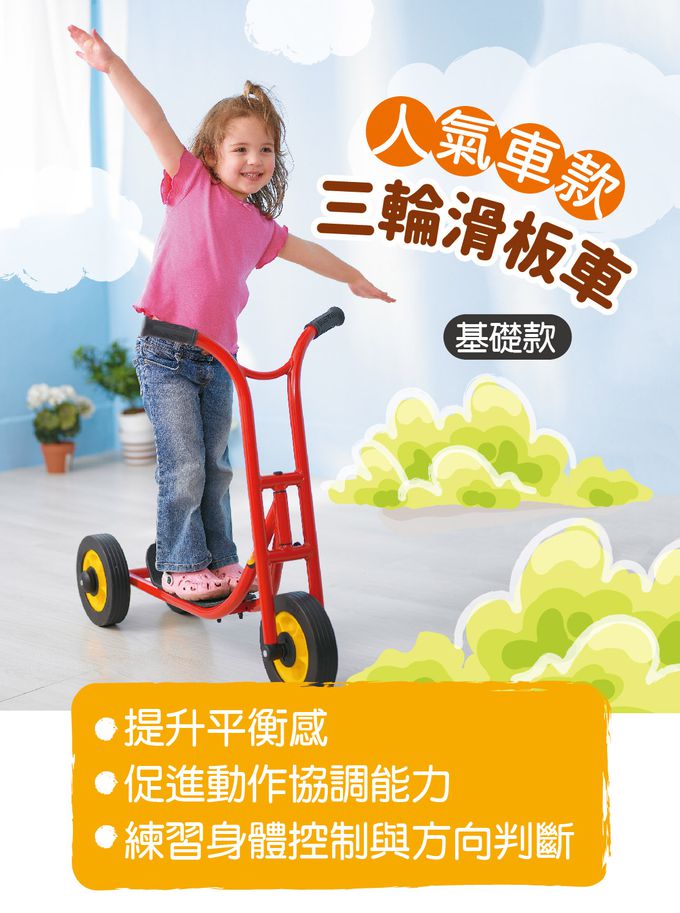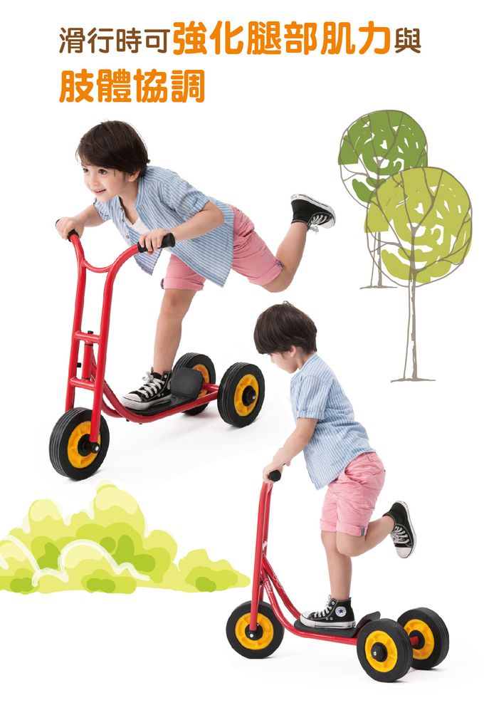 - 透過單腳滑行推動車子前進的滑板車,帶給孩子豐富的動作經驗,增進平衡感、協調性與動作計劃的能力。