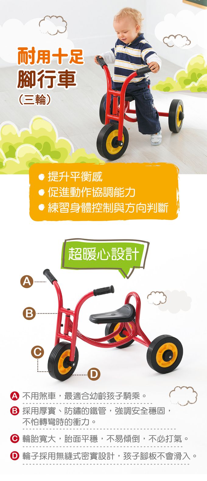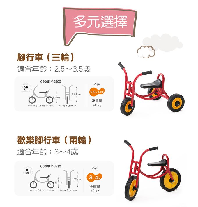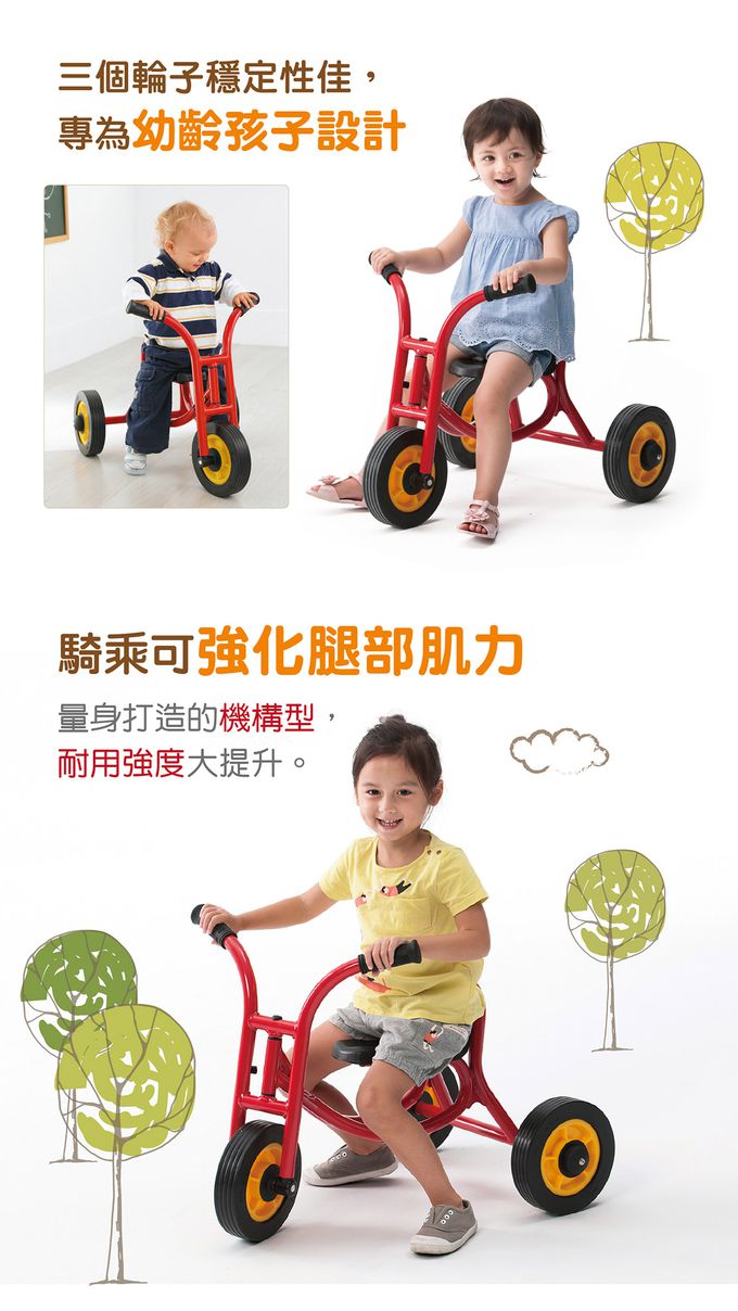- 專為幼齡孩子設計的小車,讓他們先學會雙腿划動使車子前進,促進腿部大肌肉發展及體驗移動的樂趣,漸進到可以踩踏的樂趣。