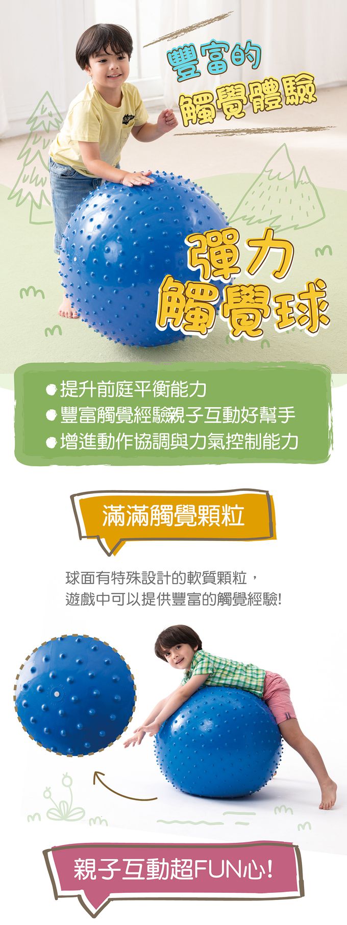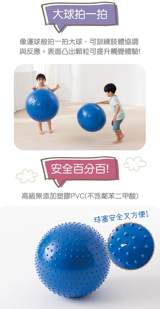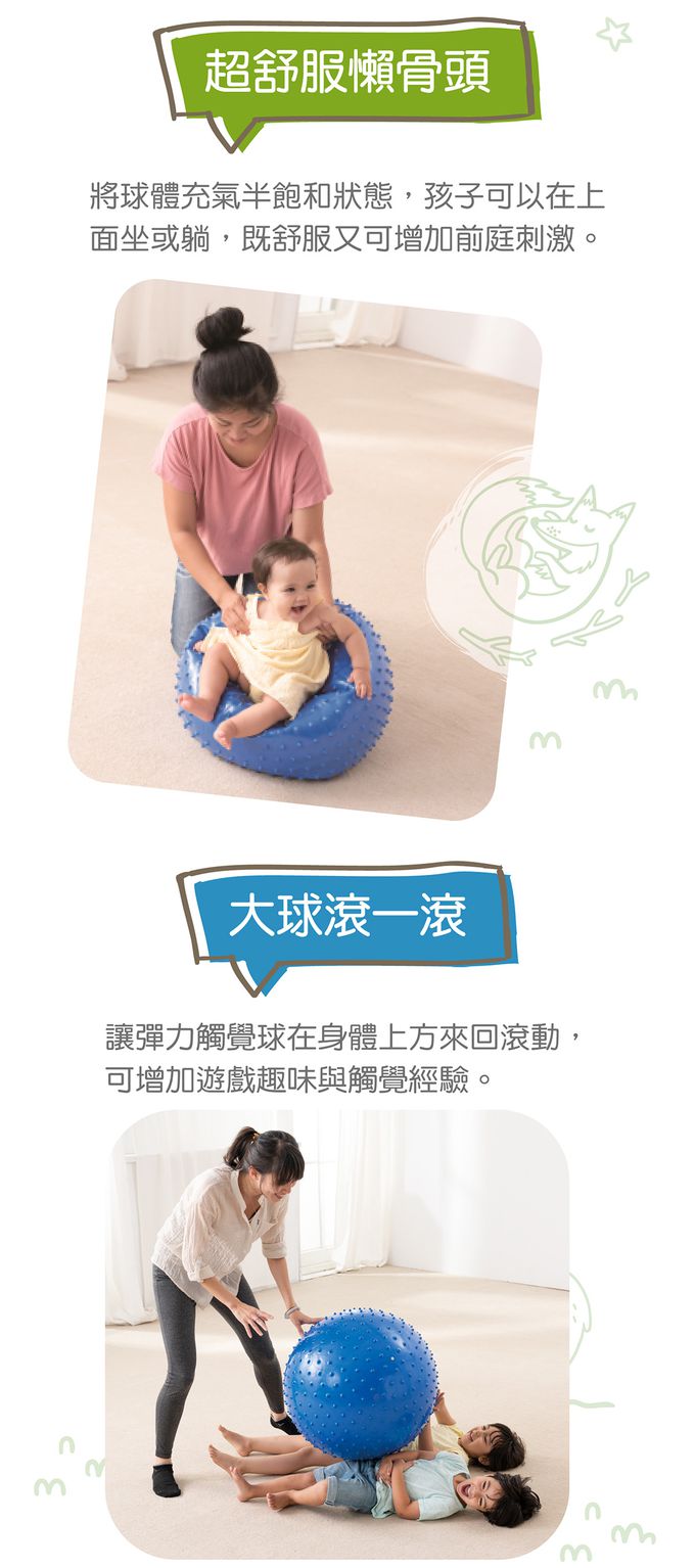 球上運動,如躺、坐、趴或拍、推、滾…等都是好玩的互動遊戲。