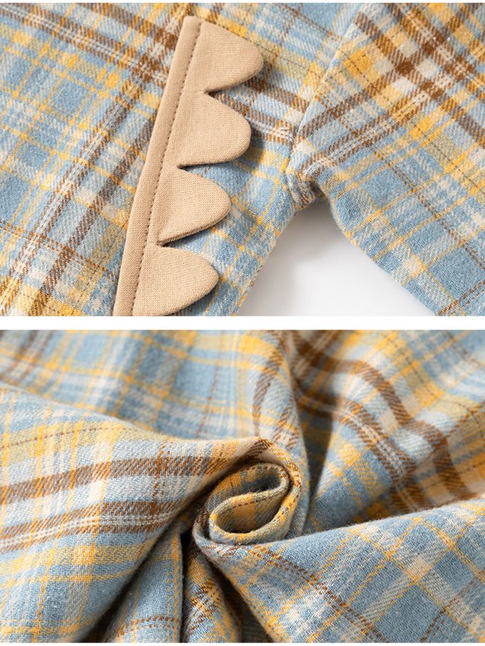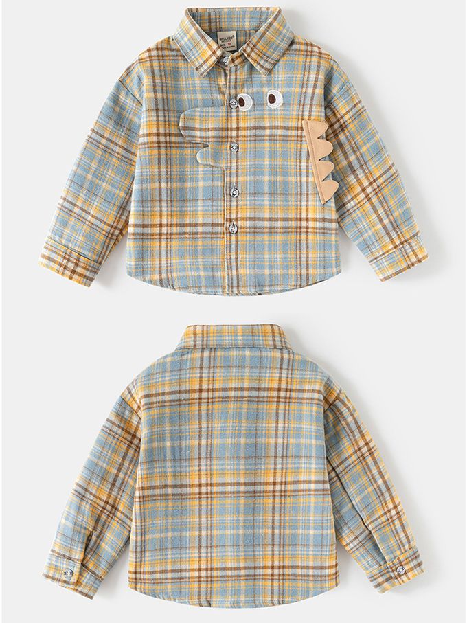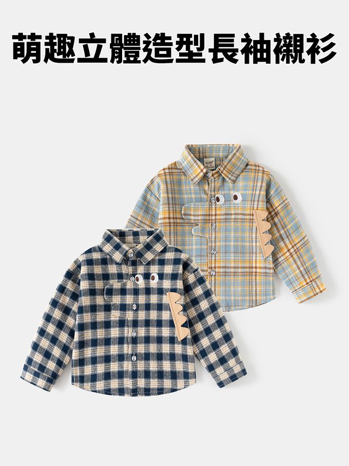 萌趣立體造型長袖襯衫-恐龍-黃藍格紋