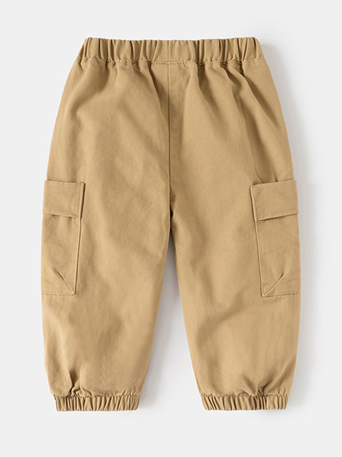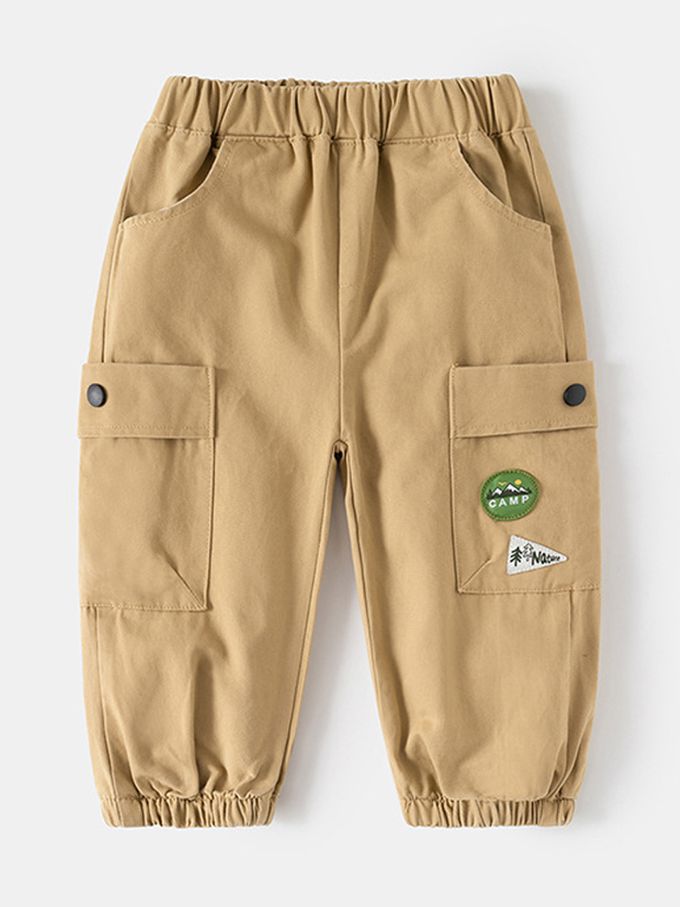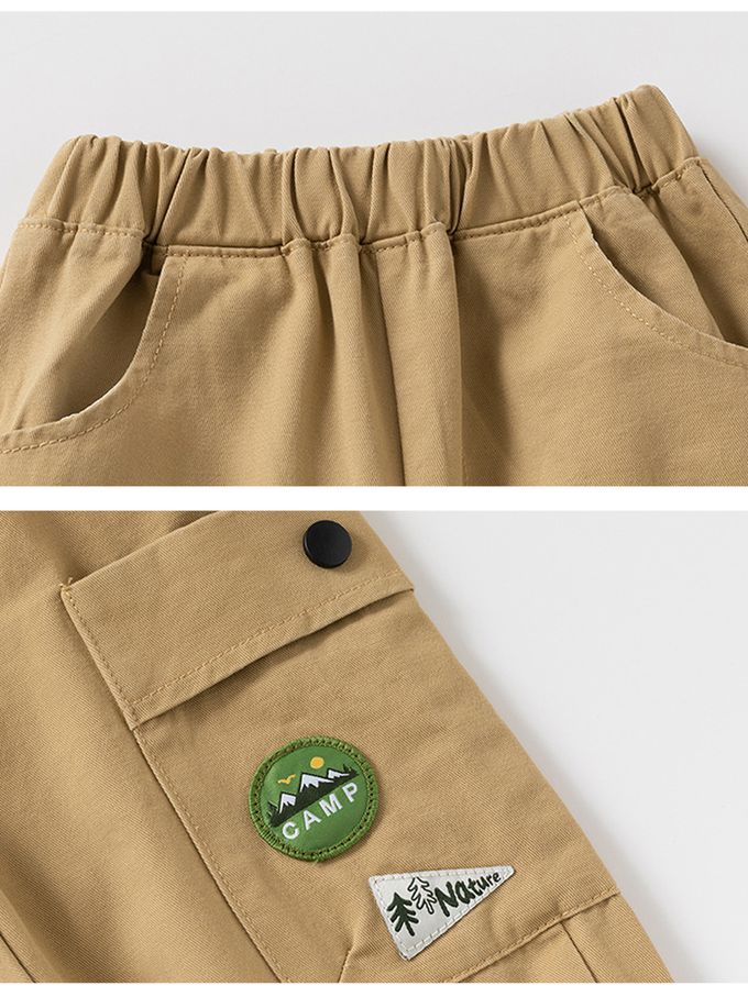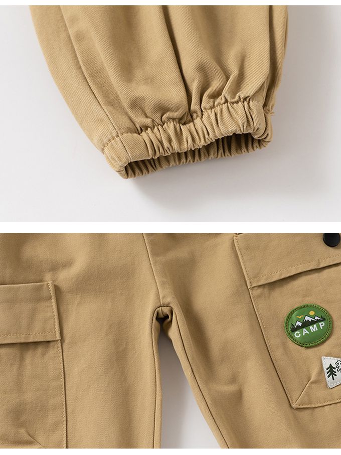 純棉腰鬆緊休閒長褲-徽章口袋-卡其