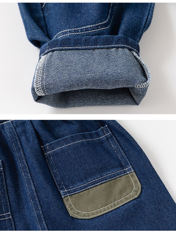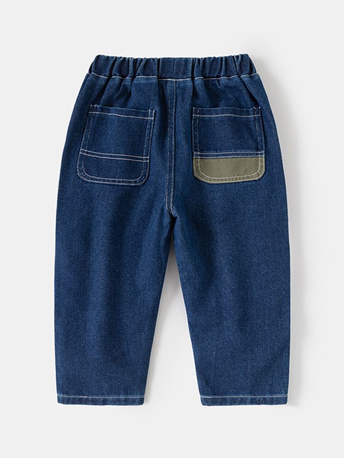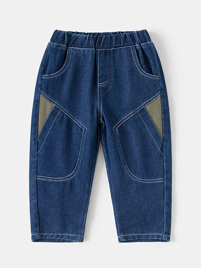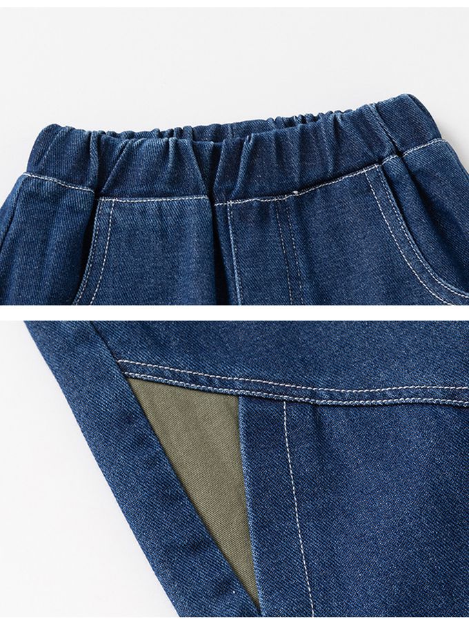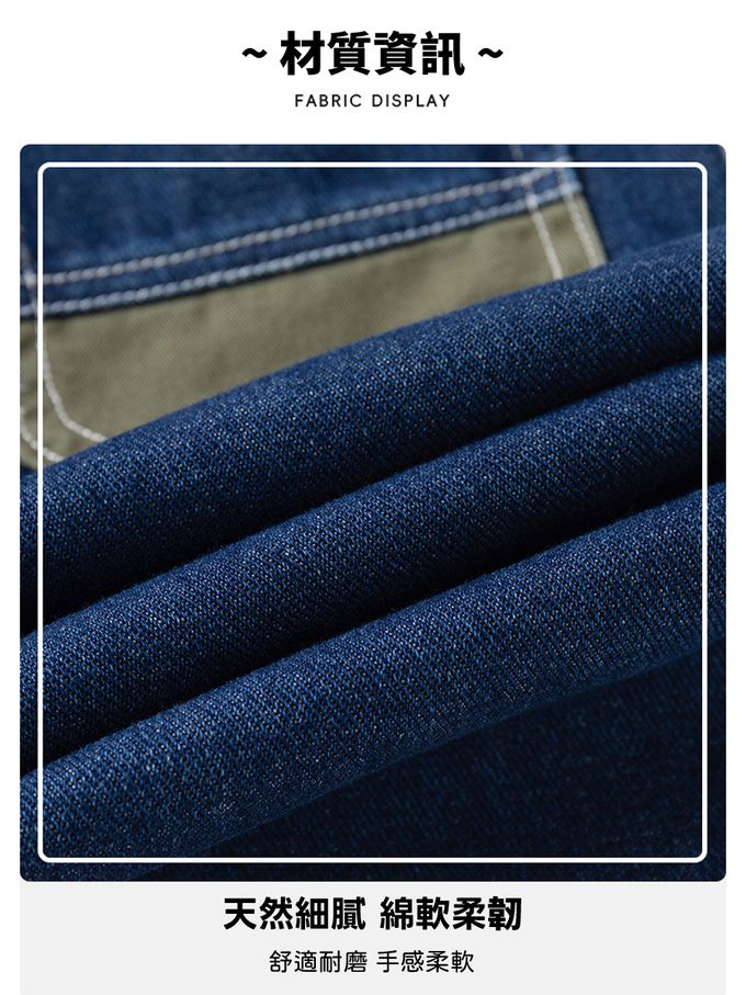 腰鬆緊休閒牛仔長褲-造型拼色-藍色