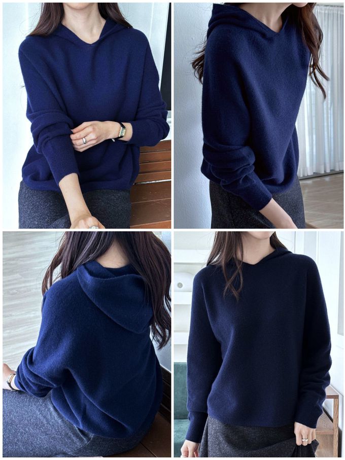 韓國女裝連線 - 55%美麗諾羊毛輕盈暖感連帽針織衫-海軍藍 (FREE)
