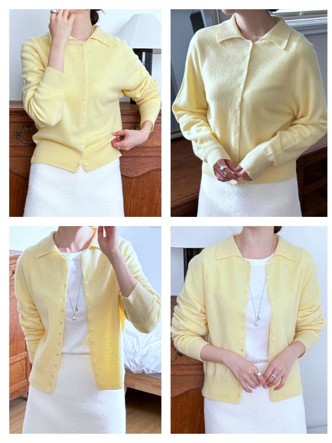 韓國女裝連線 - 80%超細羊毛細緻翻領針織外套-淺黃 (FREE)