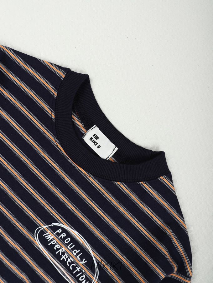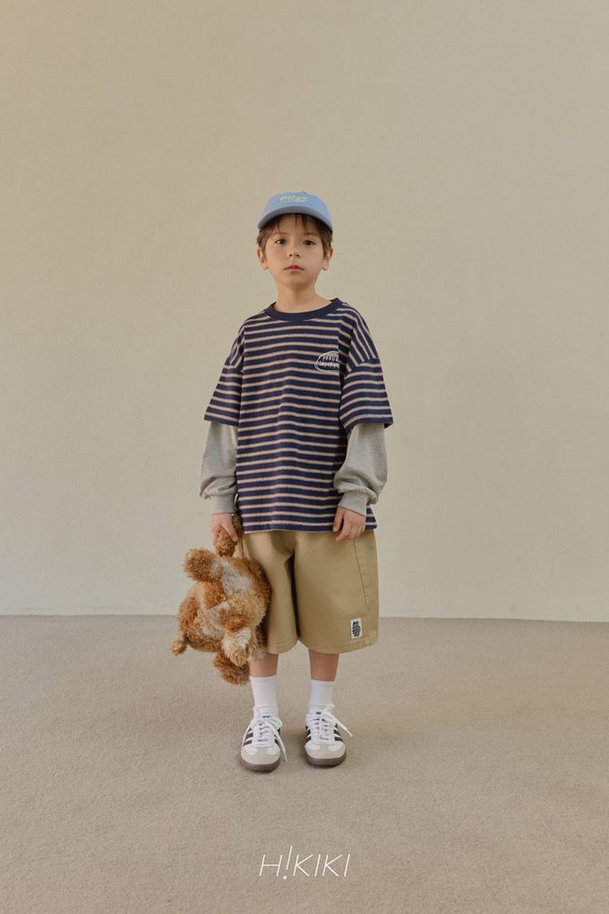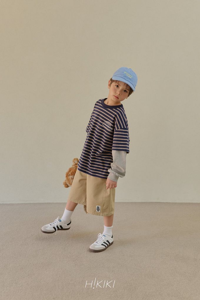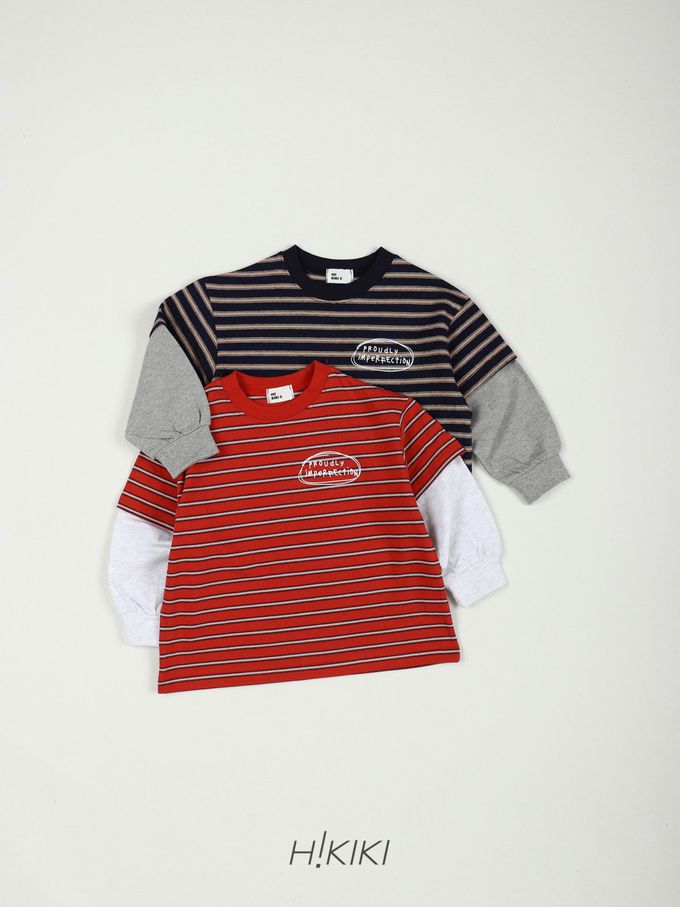 韓國南大門童裝 - HIKIKI 假兩件層次拼袖條紋長袖上衣-墨藍X灰