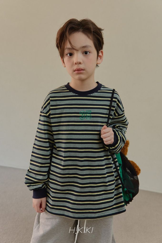 韓國南大門童裝 - HIKIKI 休閒拼色細條紋長袖上衣-數字35-墨藍