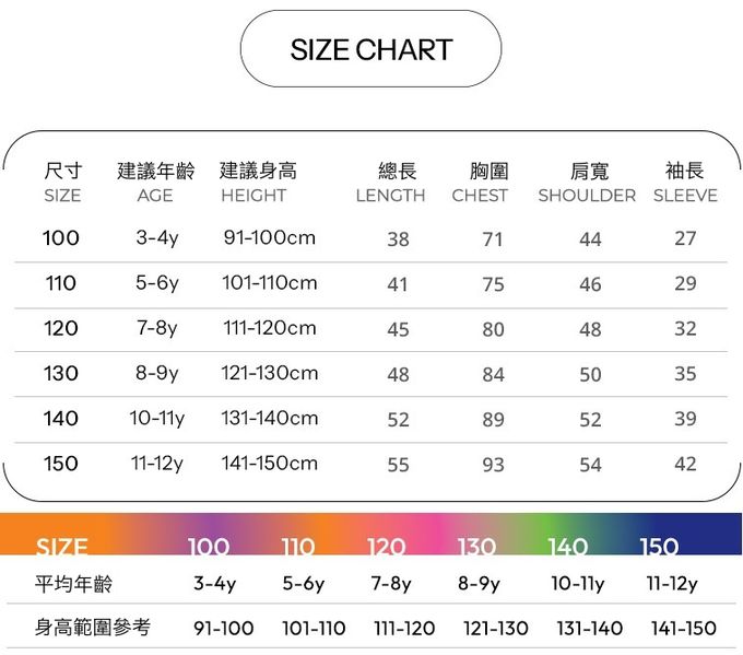 1. 尺寸表單位皆為公分(cm),實際尺寸會因布料彈性、水洗、測量起迄點等因素略有誤差。建議參考孩子平時穿著衣物尺寸進行選購。