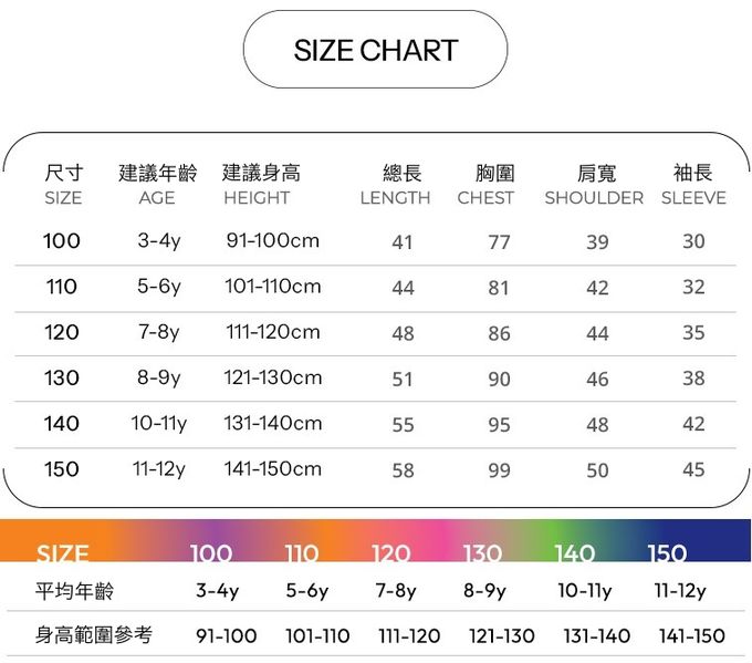 1. 尺寸表單位皆為公分(cm),實際尺寸會因布料彈性、水洗、測量起迄點等因素略有誤差。建議參考孩子平時穿著衣物尺寸進行選購。