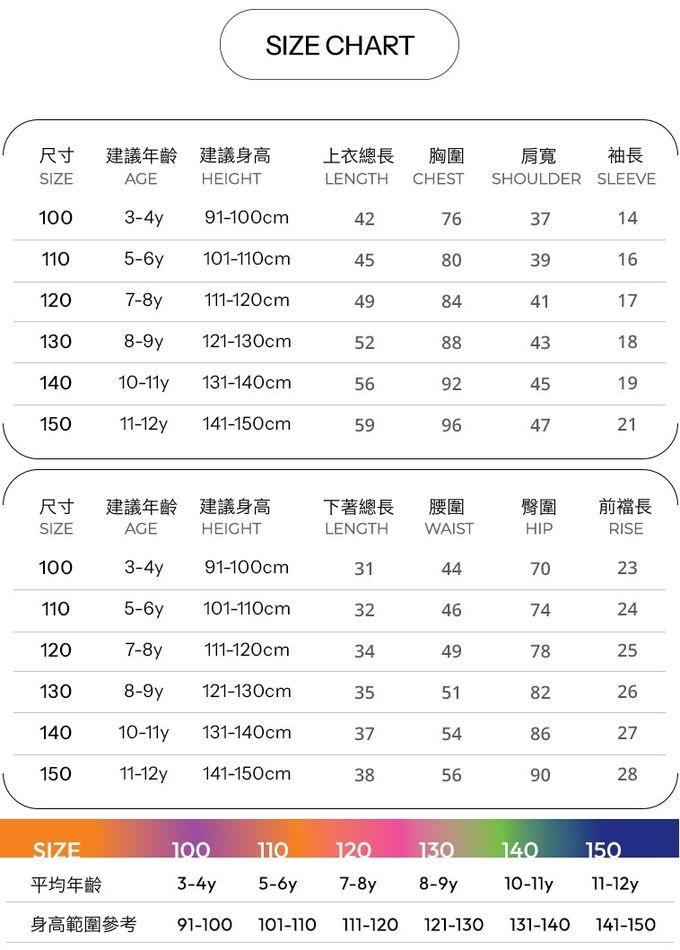 1. 尺寸表單位皆為公分(cm),實際尺寸會因布料彈性、水洗、測量起迄點等因素略有誤差。建議參考孩子平時穿著衣物尺寸進行選購。