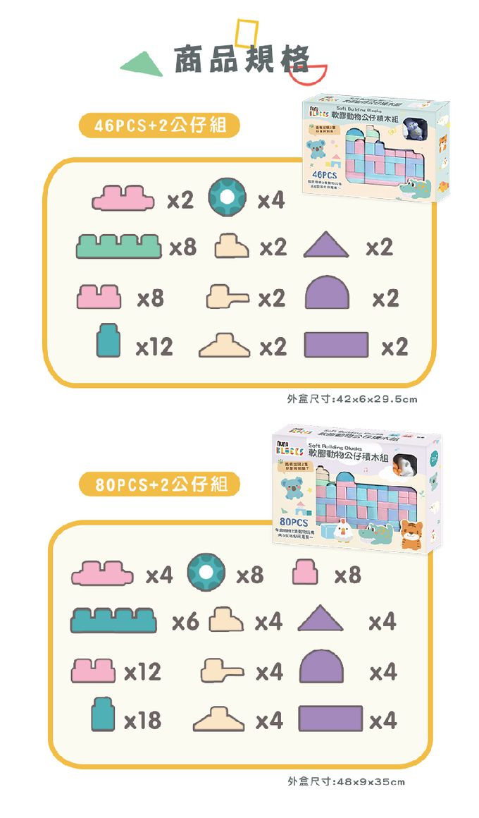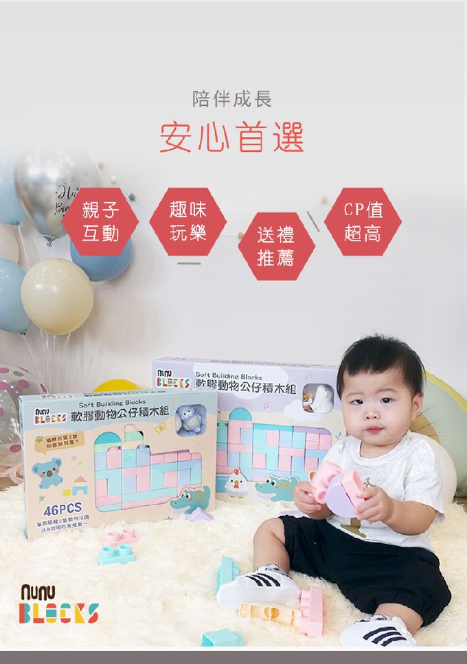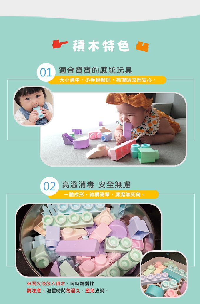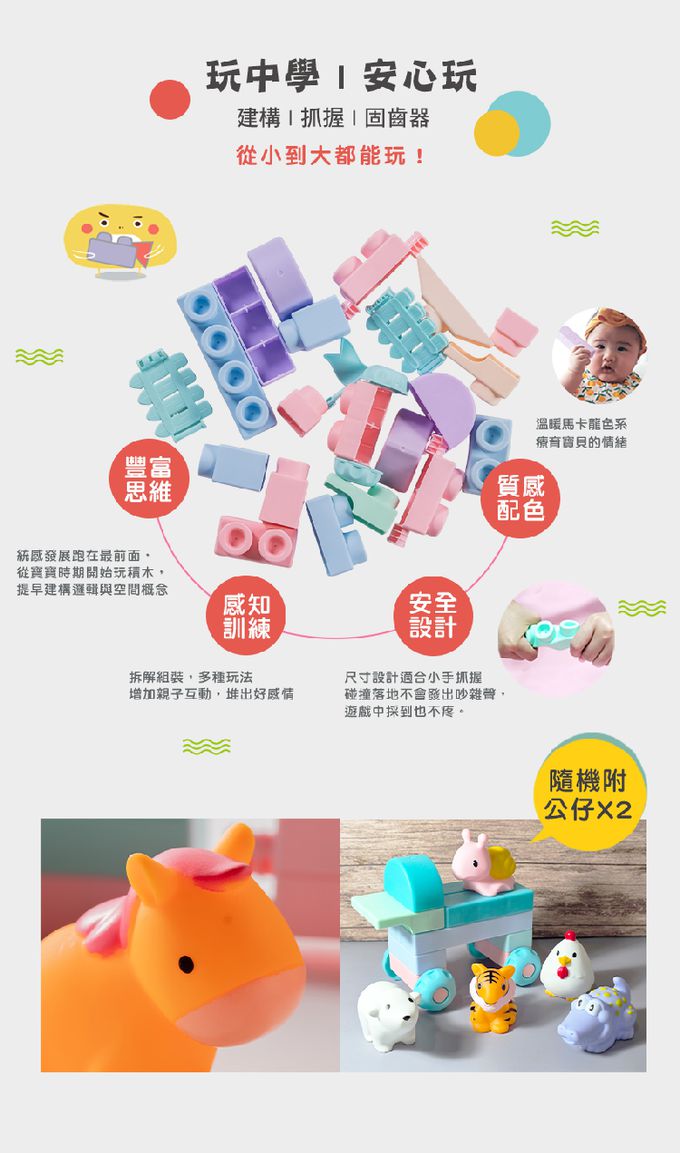 ▲ 寶寶玩具首選的第一組感統玩具▲ 大小適中,寶貝輕鬆抓握▲ 質地柔軟Q彈、圓潤邊角設計▲ 一體成形,結構簡單,清潔無死角▲ ST檢驗合格,可使用高溫消毒(切勿放入鍋水烹煮)※ 產品內所附動物公仔為角色扮演之玩具,請避免讓小孩放入口中啃咬。